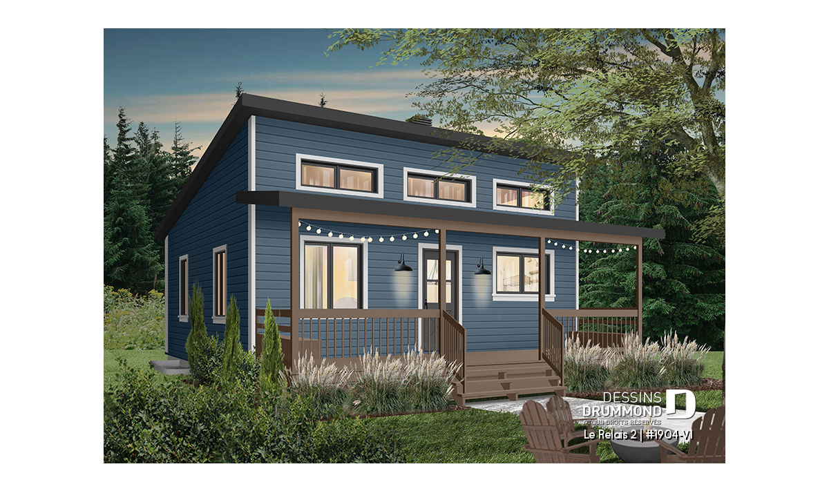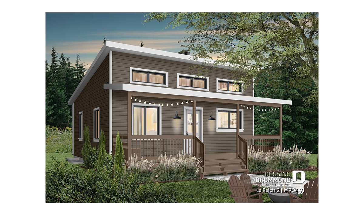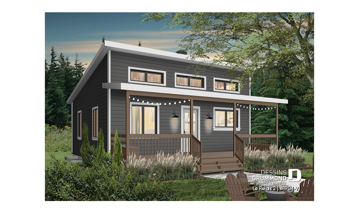 Plan de chalet économique avec sous-sol, balcon couvert, une chambre, poêle à bois, cathédral
