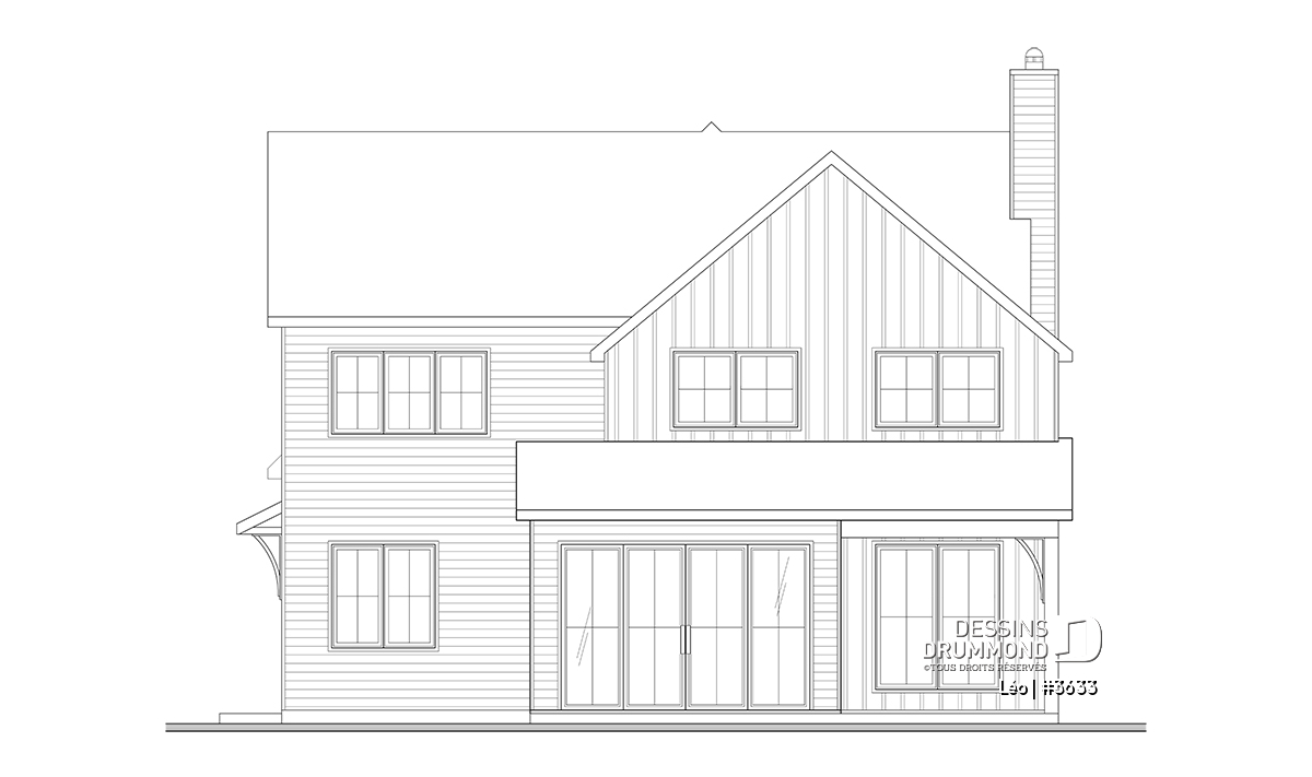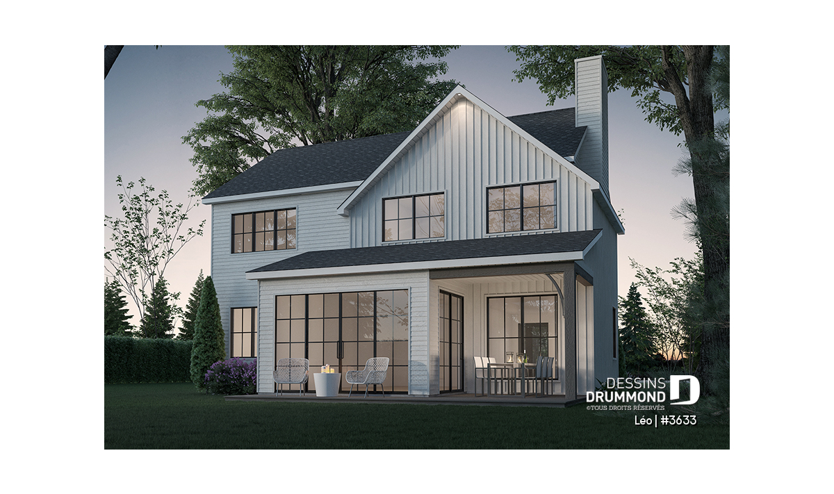 Le plan de maison farmhouse LÉO (#3633) propose 2150 pi.ca. aménagés sur 2 étages. La fondation est de type dalle flottante, mais nous offrons aussi d'autres options pour ceux qui aimeraient avoir un sous-sol régulier ou autres. Tous les plafonds du rez-de-chaussée sont à 9' de hauteur, ce qui donne une belle amplitude aux différents espaces.