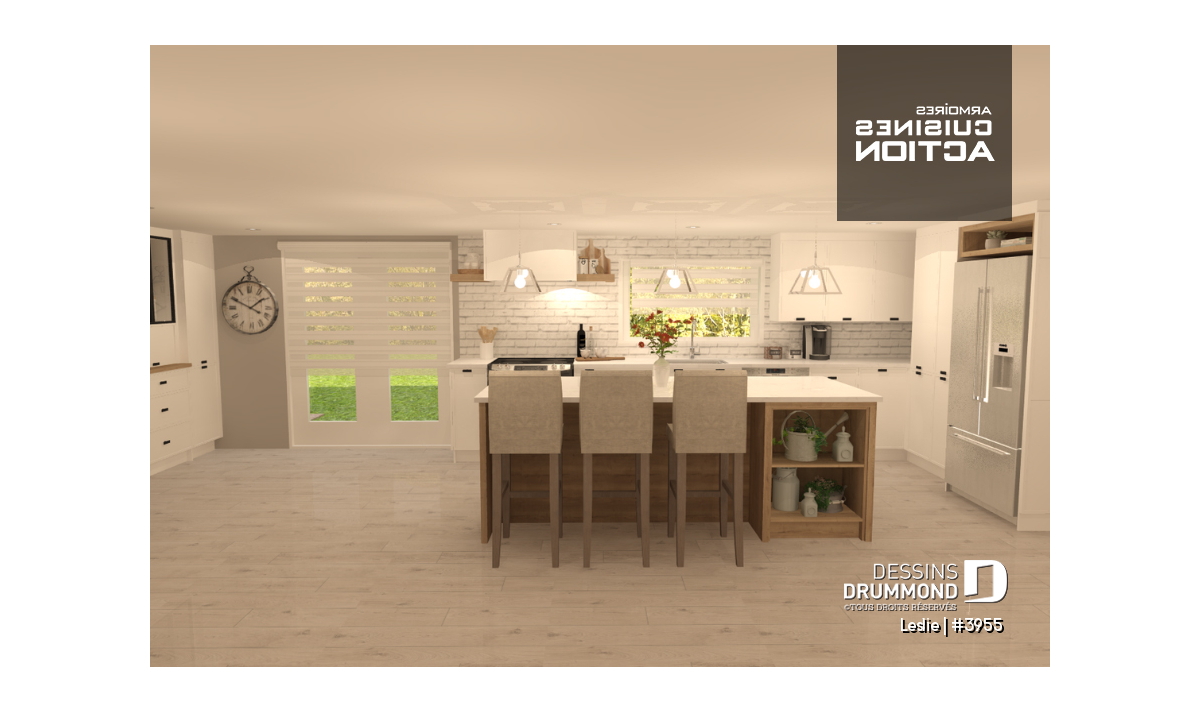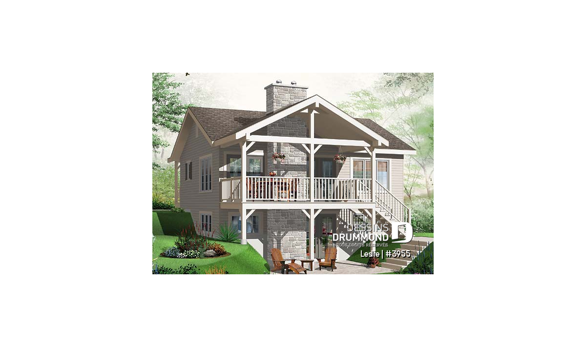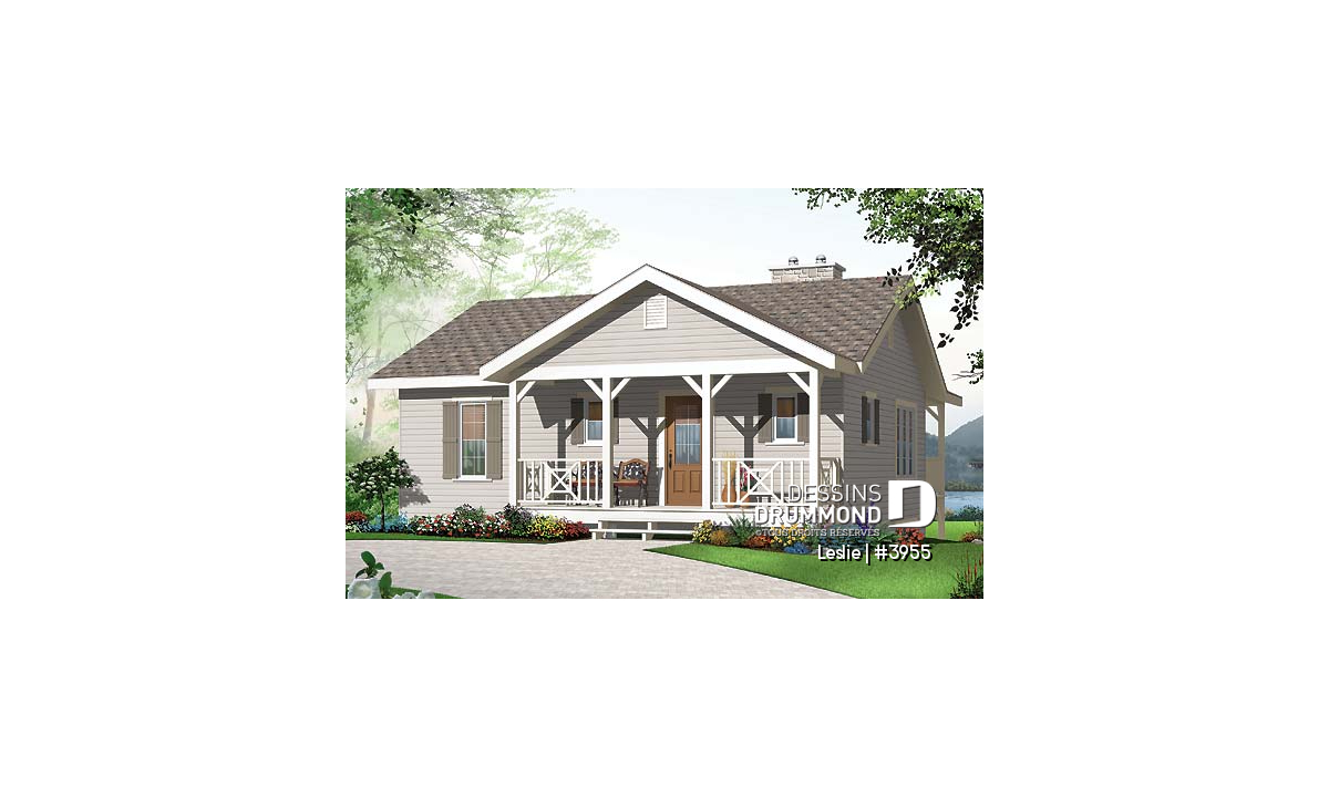 Vue de l'avant, ce joli plain-pied de style champêtre avec grand véranda couvert et chambre des maîtres au rez-de-chaussé avec garde robe de style walk-in, une salle de bains complète avec bain en coin et douche en coin a un plan plancher entièrement ouvert dans l’espace familiale avec un grand garde robe à l'entrée et un garde manger/lingerie pratique. Un abondance de lumière naturelle provient des nombreuses fenêtres et porte patio triple sur trois côtés de cet espace. Un grand foyer sur le côté salon ajoute de l'ambiance sans enlever de la vue de l'extérieur de la grande terrasse couverte à l'arrière. La cuisine en forme de "L" prévoit amplement d’espace pour un îlot lunch et la salle à manger est assez grande pour une table à six.