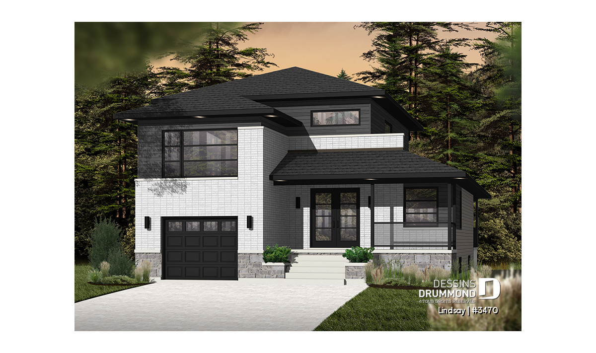 Plan de maison contemporaine à étage avec garage, aire ouverte lumineuse et terrasse couverte – LINSDAY (#3470)