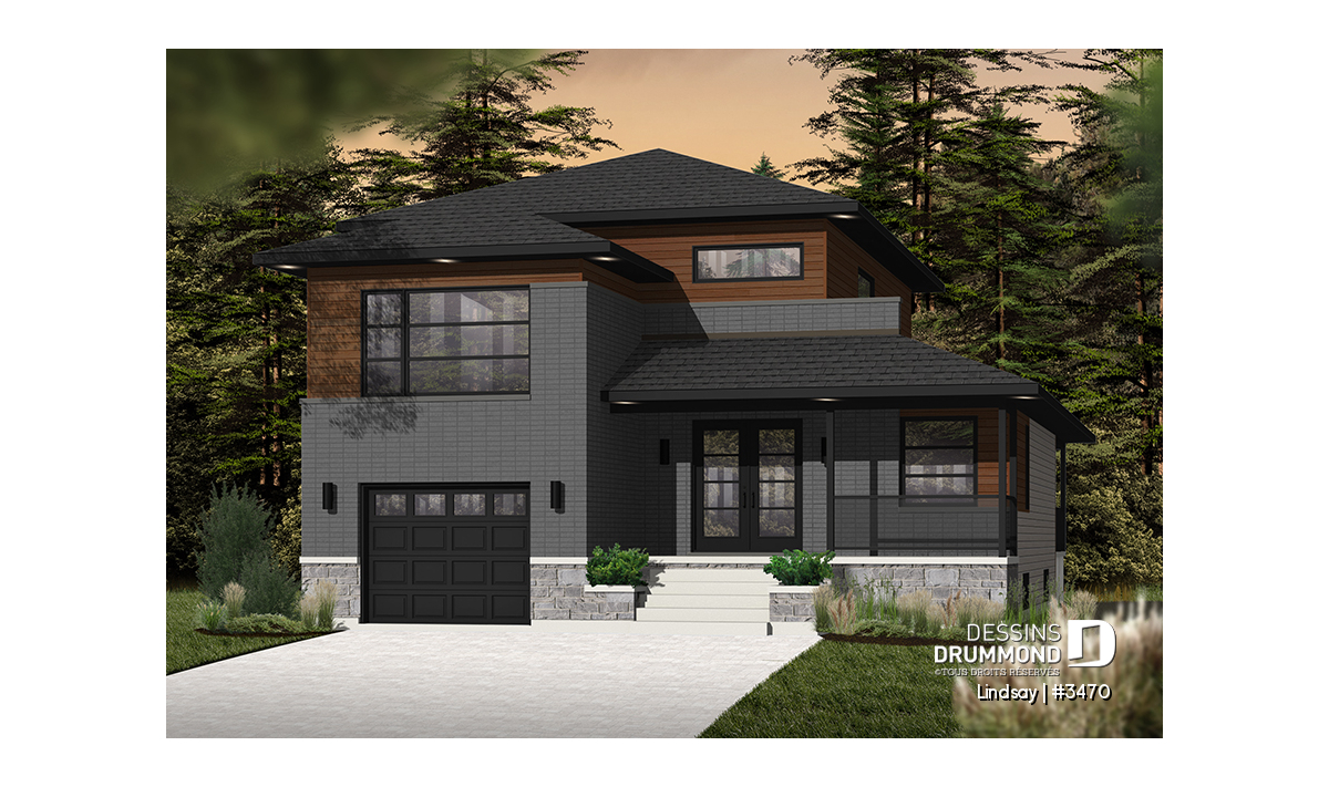 Vue avant - MODÈLE DE BASE - Plan modèle contemporain, 3 à 4 chambres, bureau, foyer, îlot à la cuisine, balcon arrière couvert, garage - Lindsay