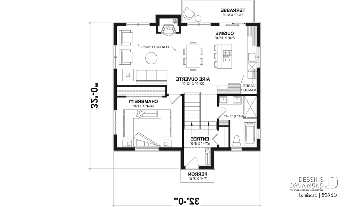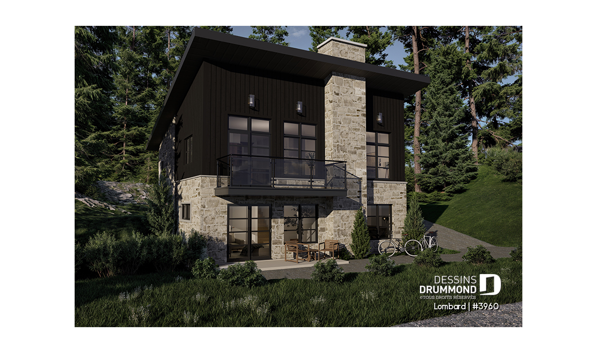 Ce plan de chalet de style moderne rustique se distingue par son caractère unique et chaleureux. Les matériaux foncés et la pierre utilisés pour son extérieur lui confèrent une allure à la fois contemporaine et rustique, parfaite pour les amateurs d’authenticité. Grâce à sa fenestration abondante, ce modèle offre une vue panoramique imprenable sur l’arrière du terrain tout en maximisant la lumière naturelle. L’effet de grandeur est renforcé par un plafond de 10 pieds dans l’aire d’activités entièrement ouverte sur l’arrière, créant un espace convivial et lumineux.