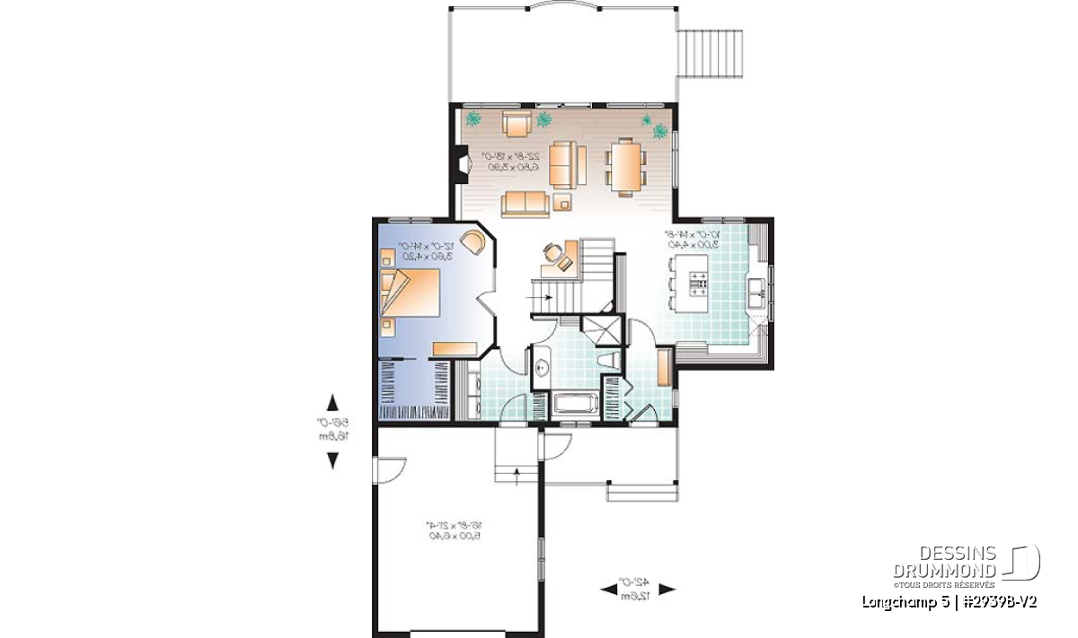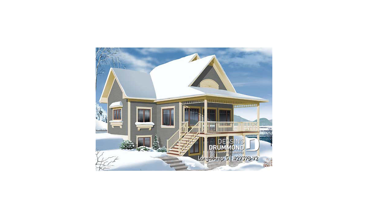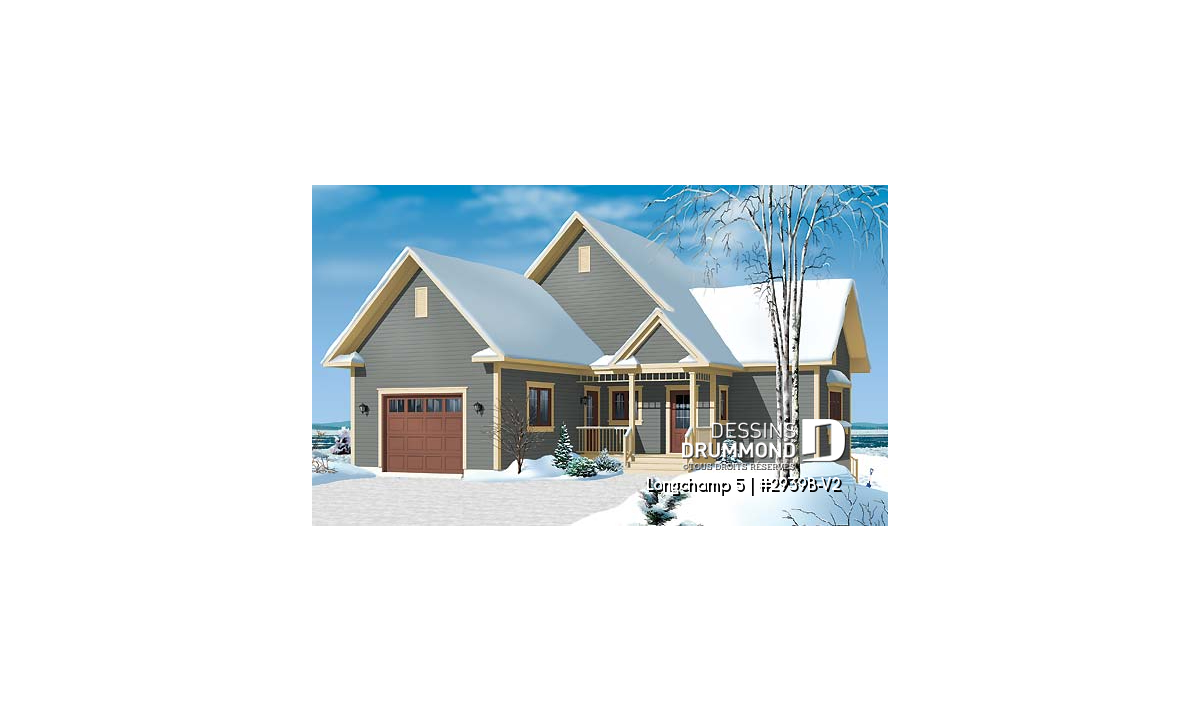 Conçu initialement sous le numéro de plan 2939, ce dernier s’est vu offrir différents modèles versions comme le 2939A, proposant ce même plan de façon inversée ou le 2939B avec coin buanderie prévu au rez-de-chaussée, sans oublier le 2939B-V1 pour lequel l’étage est éliminé et le sous-sol aménagé. Par contre, aucun d’entre eux ne suggérait un garage attaché et c’est pourquoi Dessins Drummond se fait un plaisir de vous offrir ce 2939B-V2.