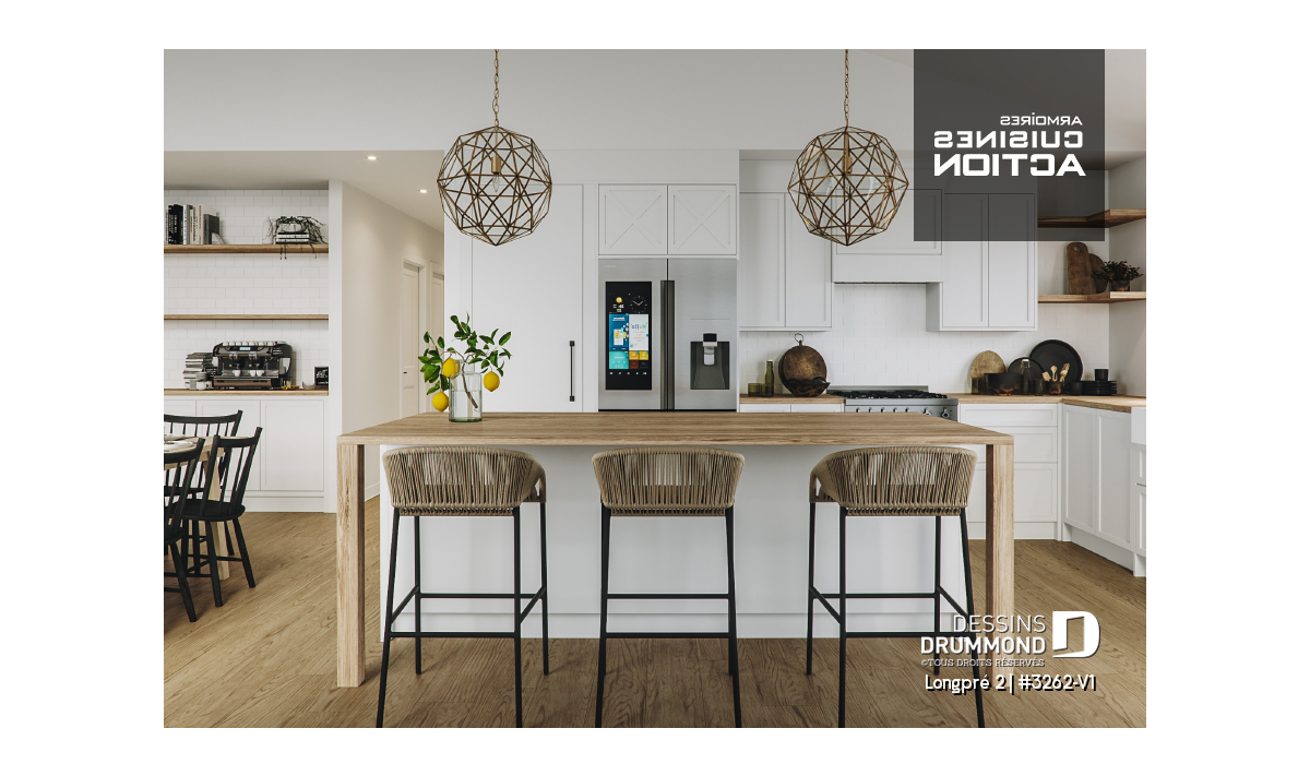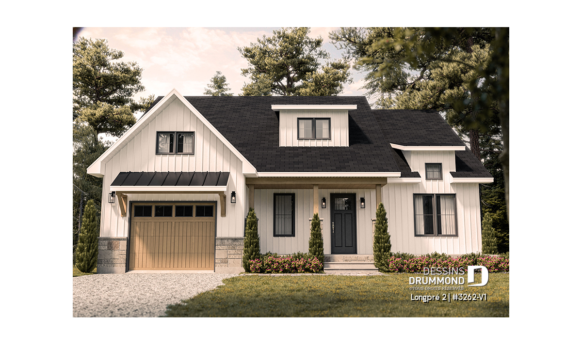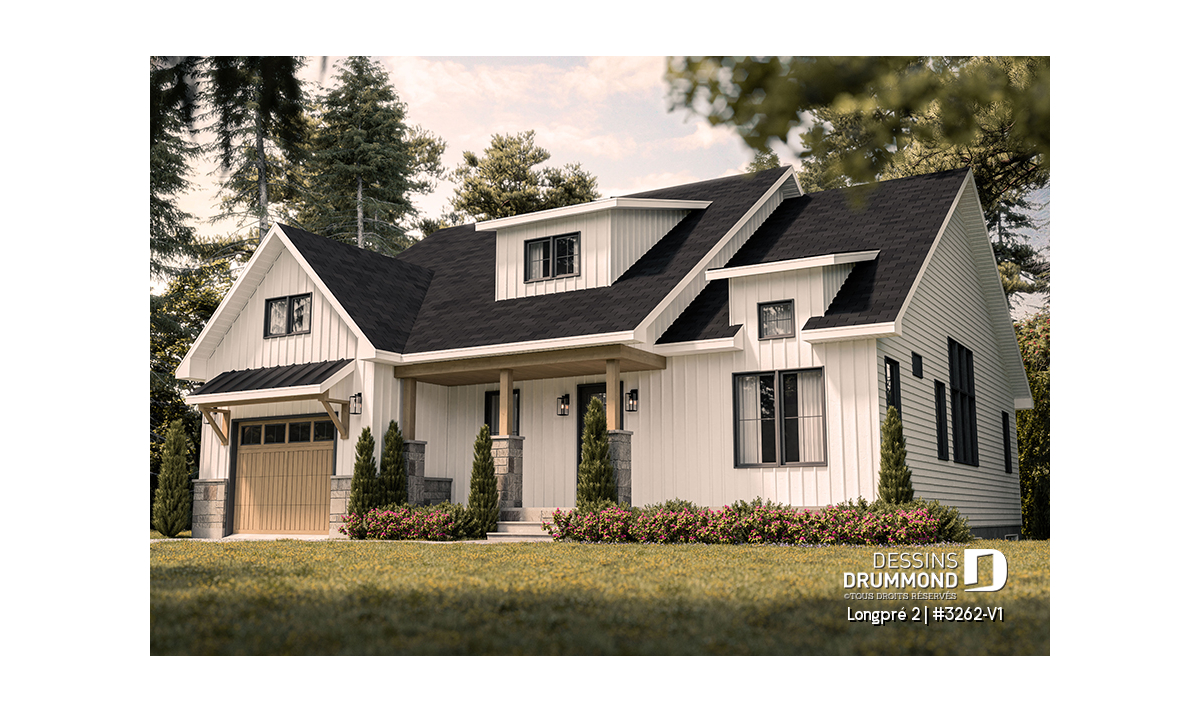 Le superbe plain-pied de style Farmhouse LONGPRÉ 2 (3262-V1) séduit au premier regard avec son garage intégré et son vaste perron avant abrité, parfait pour accueillir vos invités ou profiter des saisons québécoises à l’abri. L’entrée par le garage se distingue par un vestiaire pratique avec banquette intégrée, pensé pour faciliter la vie de famille au quotidien et garder la maison bien organisée.