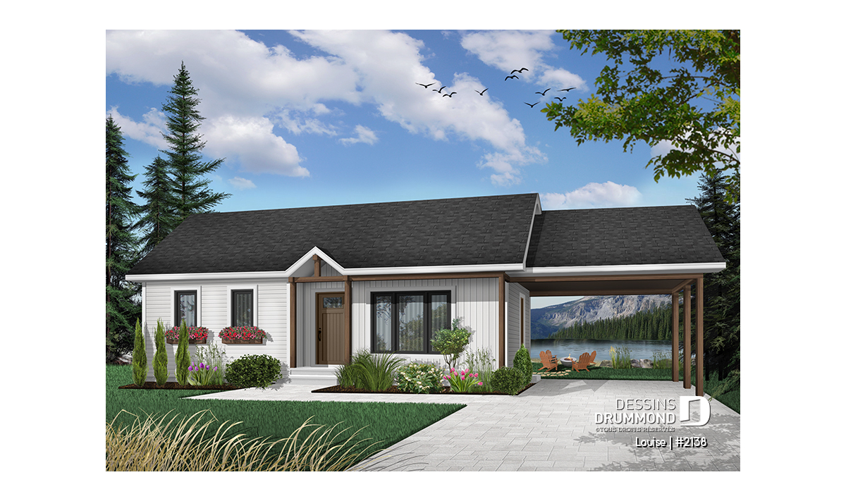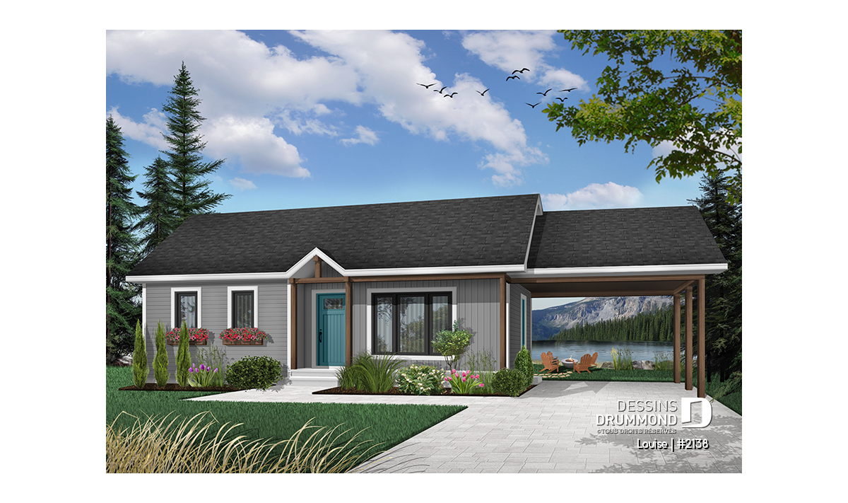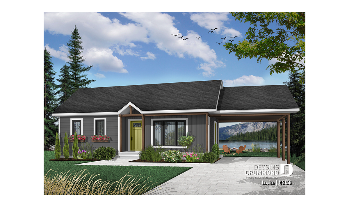 Plan de plain-pied abordable, 2 chambres, garde-manger, porte-patio, galerie arbitrée, abri auto
