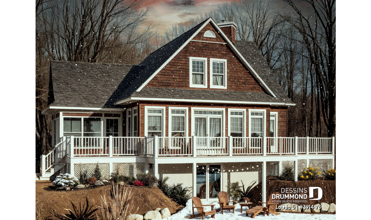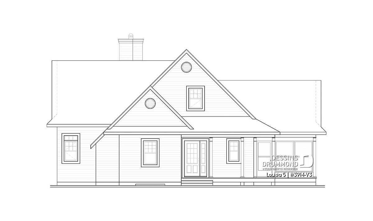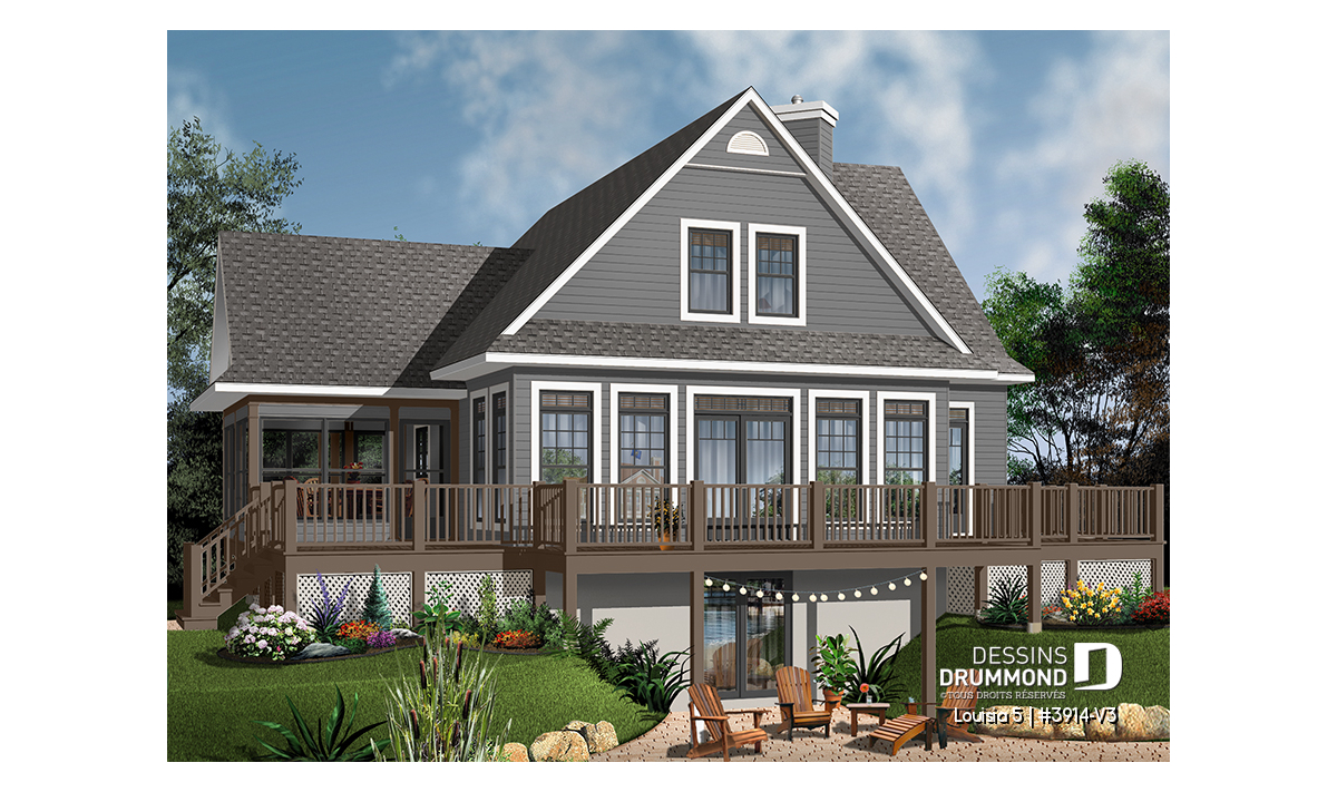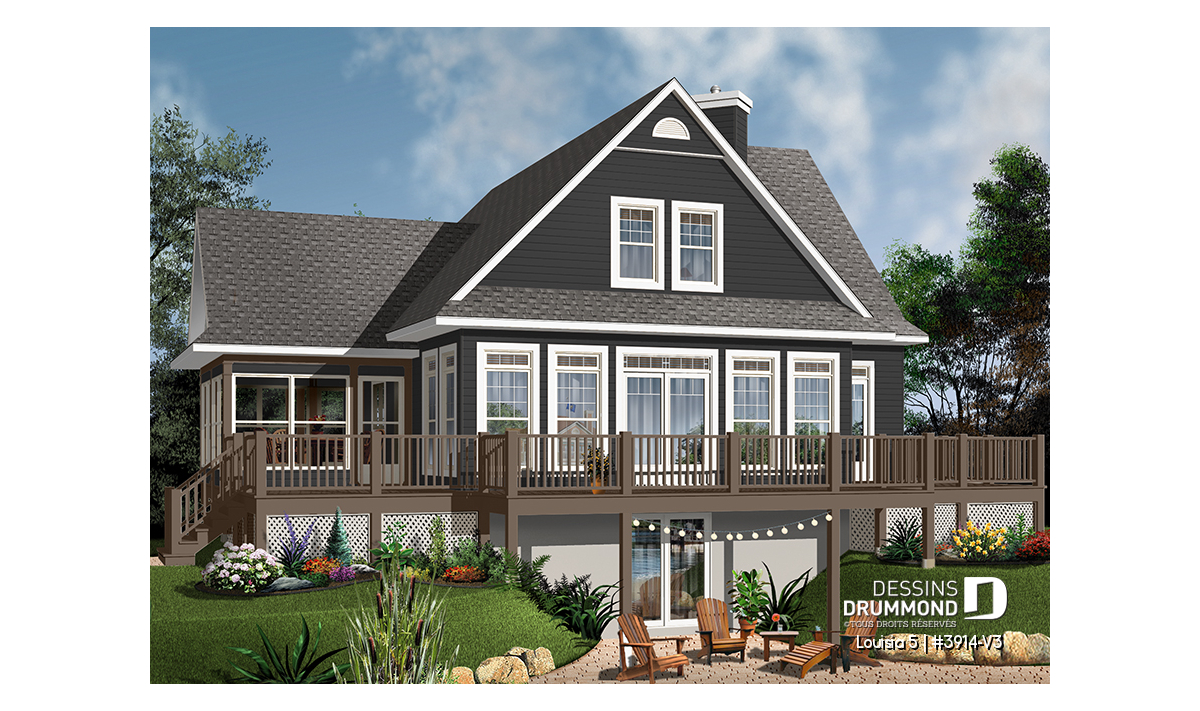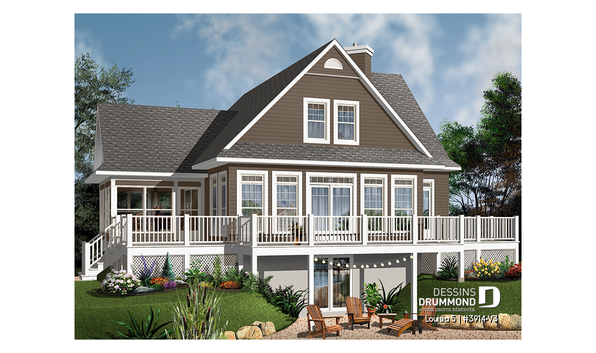 Version couleur no. 1 - Vue arrière - Plan de chalet champêtre 4 chambres, bord de l'eau, abri moustiquaire, foyer, grande terrasse, buanderie - Louisia 5