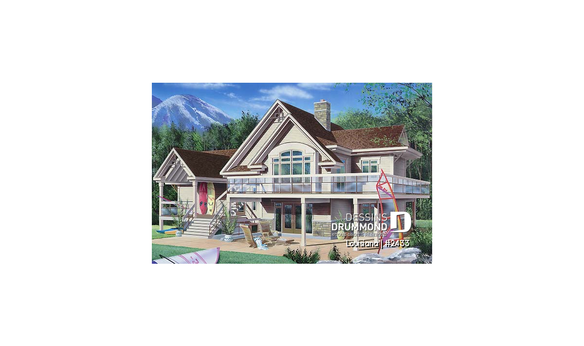 Vue arrière - MODÈLE DE BASE - Chalet bord de l'eau, 3 chambres, 3.5 salles de bain, aire ouverte, 2 salons, foyer central, grande terrass - Louisiana