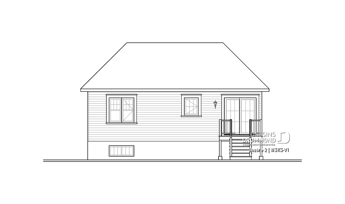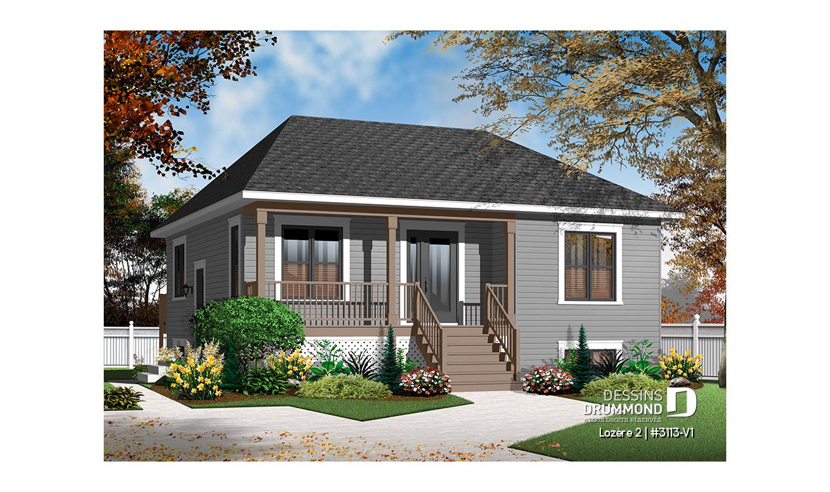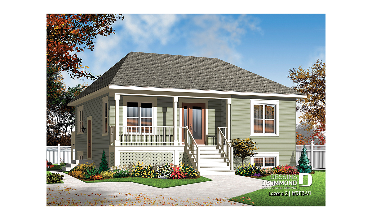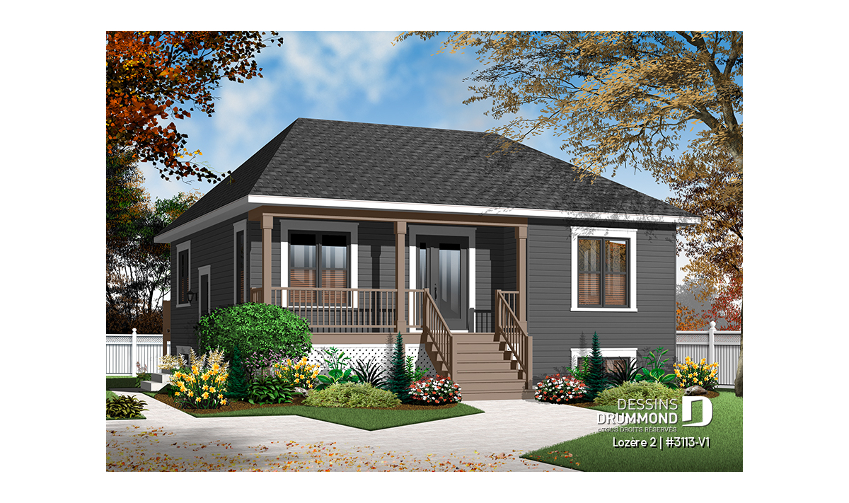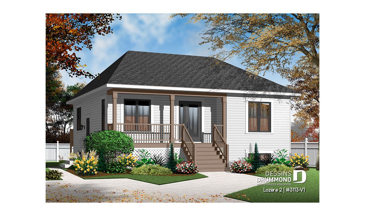 Version couleur no. 1 - Vue avant - Plan de petit plain-pied 2 chambres, fondation sortie de terre, champêtre, sous-sol aménageable - Lozère 2