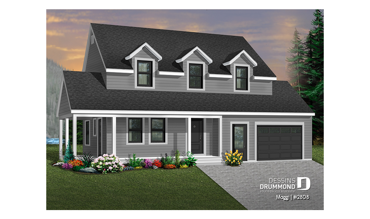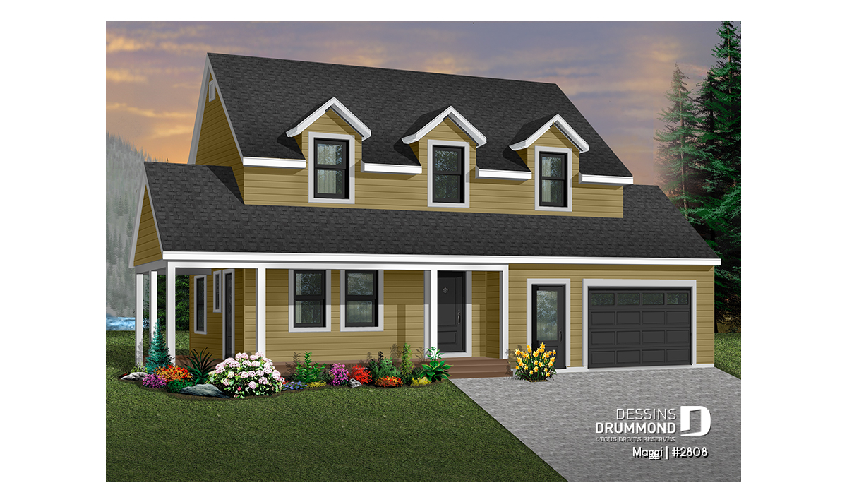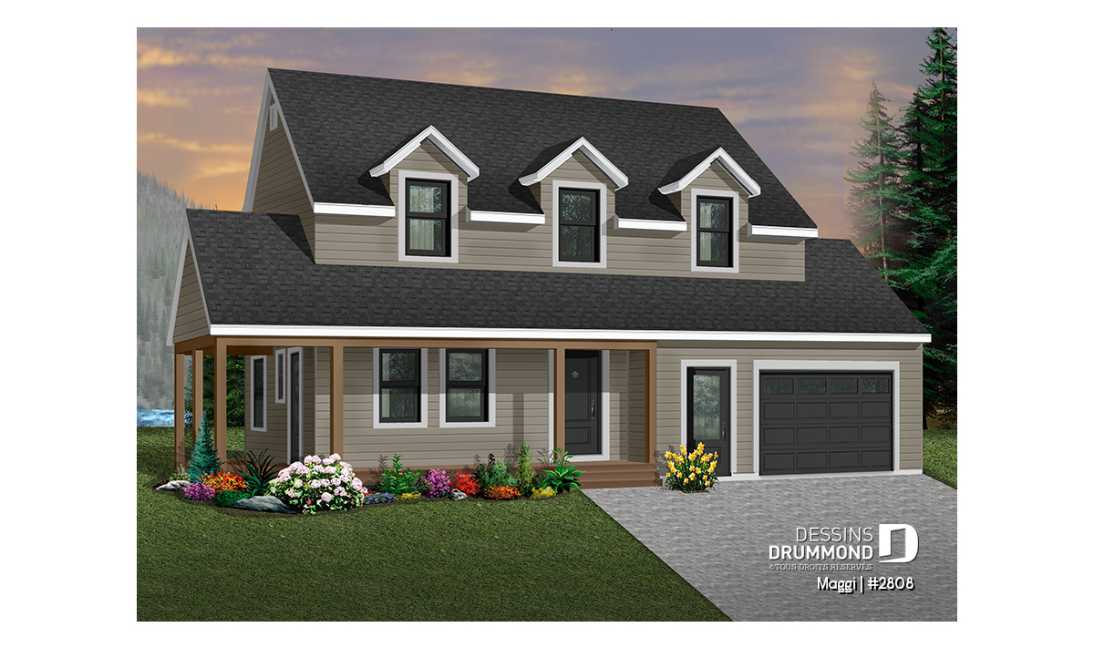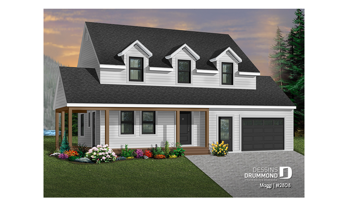 Plan de maison champêtre 3 chambres, garage, grande suite des maîtres, grand balcon couvert
