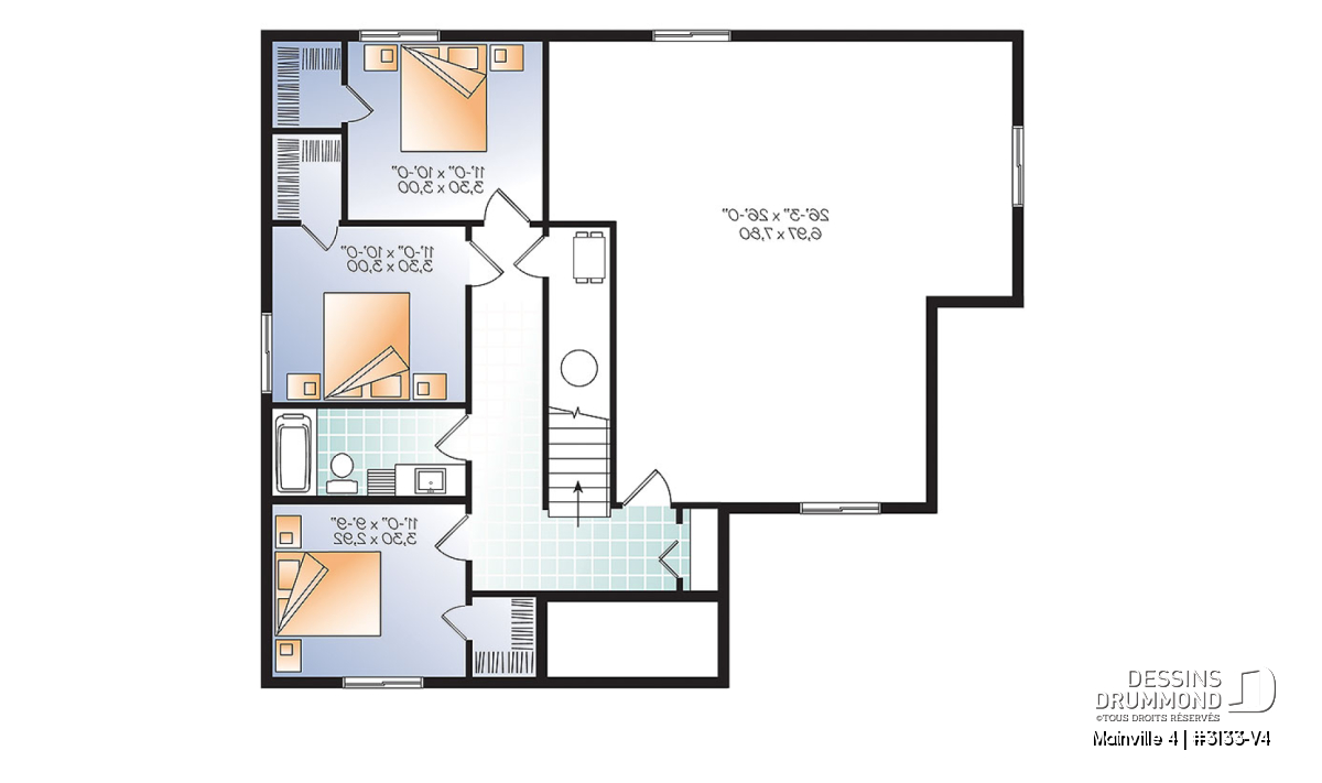 Au sous-sol, le concepteur a pris soin de sortir celui-ci suffisamment de terre afin d’offrir des fenêtres à la fois légales et de bon format à chacune des trois chambres d’environ 11pi x 10pi qui y sont prévues. D’ailleurs, chaque chambre bénéficie d’une garde-robe walk-in alors qu’une salle de bain et un vaste espace aménageable complètent fort bien ce plancher.