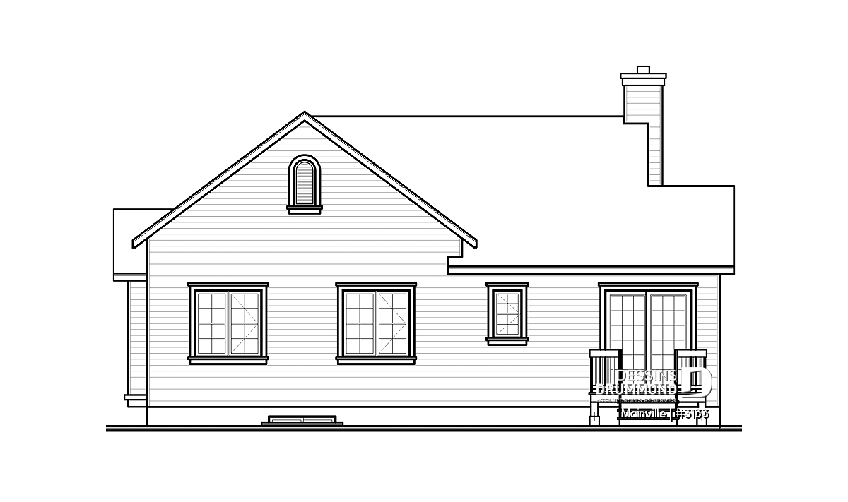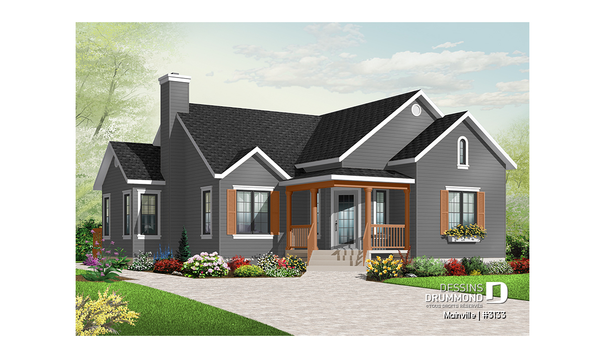 Conçu à partir du très populaire modèle de base no.2133, celui-ci en conserve les principaux attraits extérieurs dont cette belle entrée à angle qu’épouse parfaitement une galerie fort invitante, sans oublier un bon équilibre des pignons en plus de cet ajout en saillie que l’on retrouve sur le côté droit de la maison.