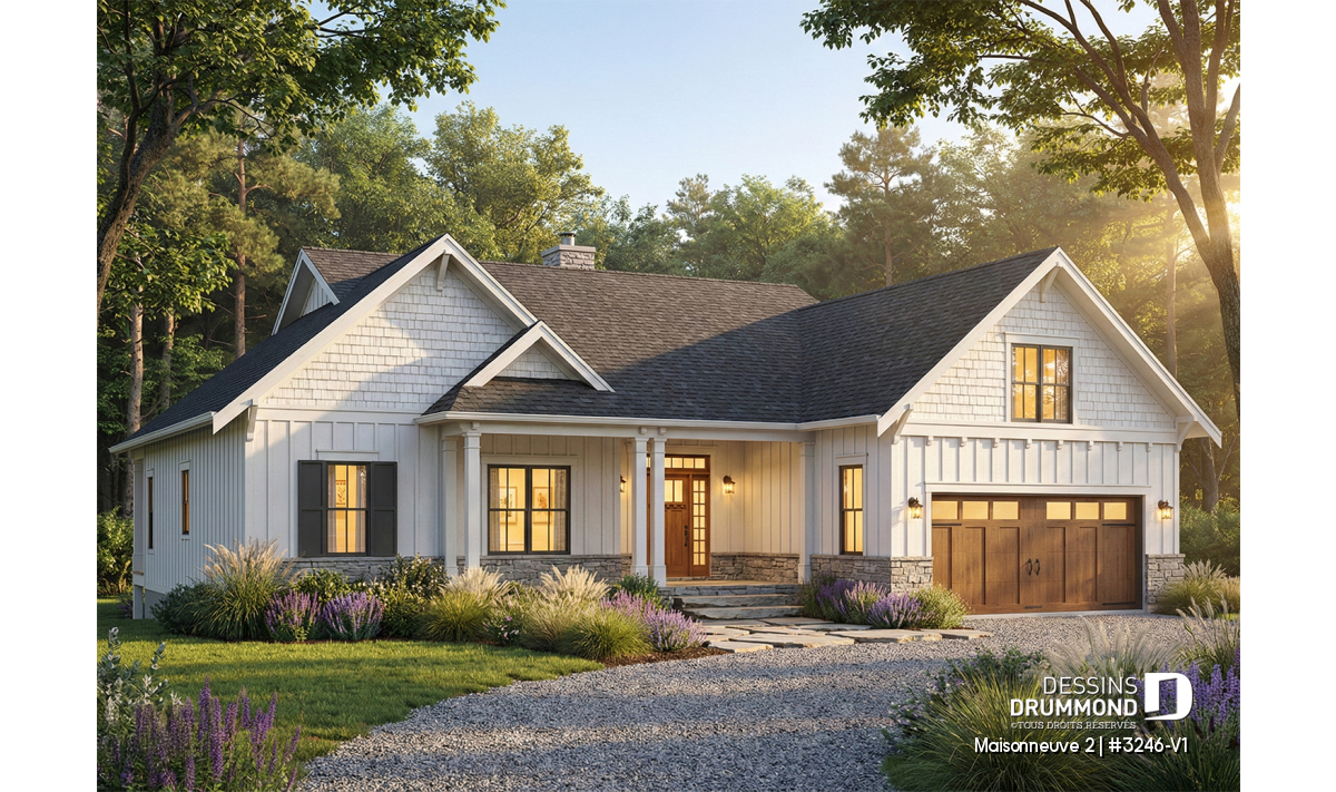 Maison de style champêtre farmhouse avec garage double et sous-sol en rez-de-jardin.