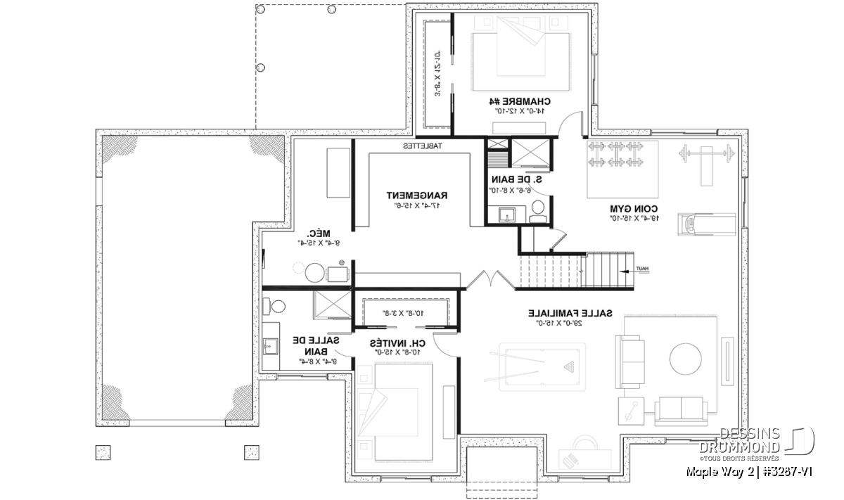 *Si vous souhaitez acheter le plan du sous-sol aménagé, tel que présenté sur la page de ce plan, veuillez sélectionner cette option dans le panier d'achat, dans la section "Sélectionner votre fondation". Si vous ne sélectionnez pas cette option, vous recevrez le sous-sol non fini, sans frais additionnel.