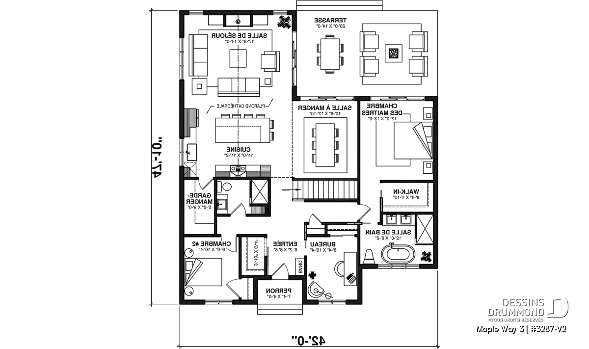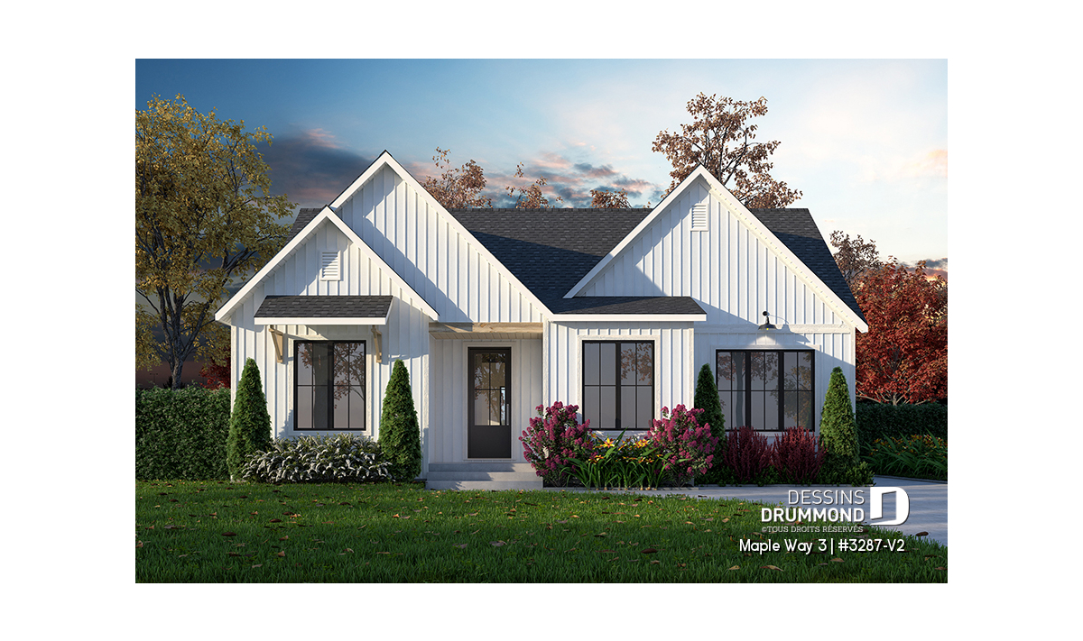 Le plan de maison plain-pied Farmhouse MAPLE WAY 3 (#3287-V2) propose un total de 3170 pc. aménagés au rez-de-chaussée et au sous-sol. Les plafonds sont à 9’ partout au rez-de-chaussée, et il y a un plafond cathédrale de 16’2’’ de hauteur à la cuisine et à la salle de séjour. Ce plan est le 3ème de la très populaire collection MAPLE WAY, et le premier n’offrant pas de garage. Ce dernier pourrait aisément être ajouté selon vos besoins, via l’un de nos 26 bureaux au Québec.