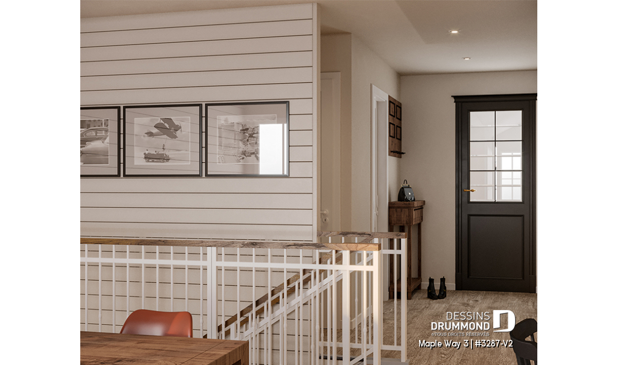 L’entrée s’ouvre sur un vestiaire de type walk-in et comporte un pratique banc vous permettant d’y déposer un sac à main ou simplement de vous y asseoir. Puis tout de suite près de l’entrée se retrouve un bureau à domicile. Nous y avons aménagé une garde-robe vous permettant ainsi une versatilité avec cette pièce pour une chambre supplémentaire, une pouponnière ou une petite salle de jeux, par exemple. Puis, sur la droite, une chambre secondaire (ou bureau #2) et une pratique salle de douche fera le bonheur d’un enfant ou de vos invités!