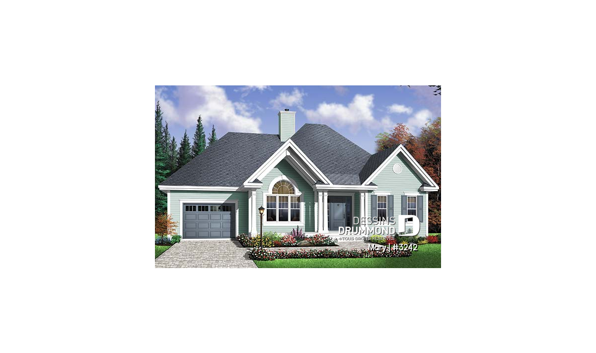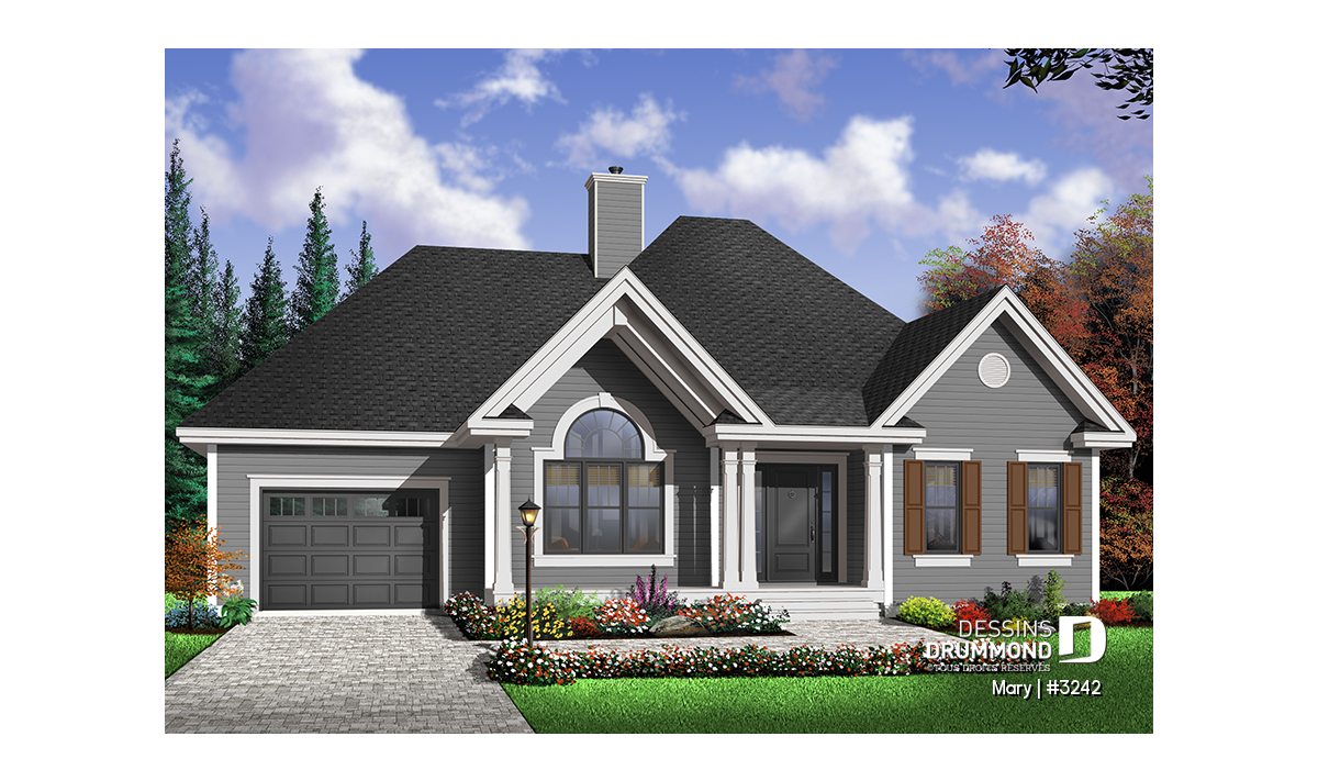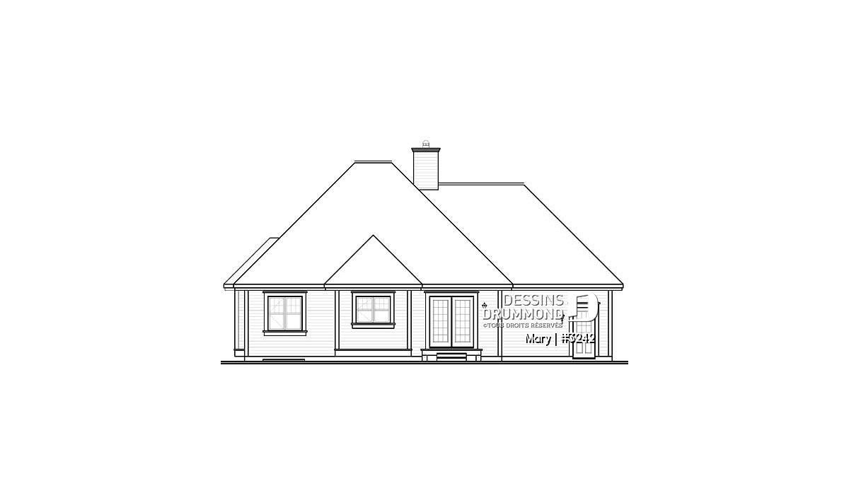 Après le vif succès remporté par le plan 2294 et sa version trois chambres numéro 2296, Dessins Drummond a cru bon de mettre sur le marché un plan à la fois similaire et aux lignes davantage « modernes ». Voici donc ce plan 3242 pour lequel, à l’instar du plan 2294, une version trois chambres, le plan 3243, est aussi disponible.