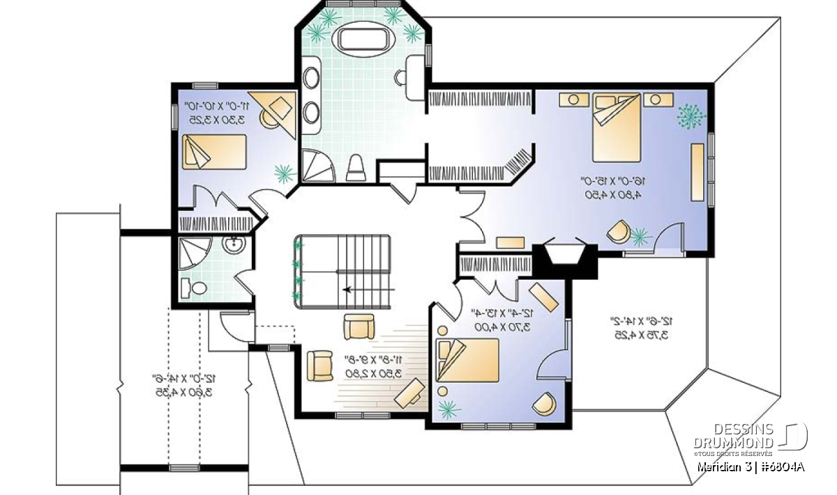 À l’étage, on retrouve toujours 3 chambres et la possibilité d’en aménager une 4è, deux accès à une terrasse à ciel ouvert dont un à la superbe suite des maîtres qui nous épate par son format, par la présence d’un foyer et d’une grande garde robe « walk-in » et, surtout, par une salle de bain privée des plus confortable. Sans oublier l’accès à un espace boni au-dessus du garage. Découvrez plusieurs plans similaires sur http://www.dessinsdrummond.com/.