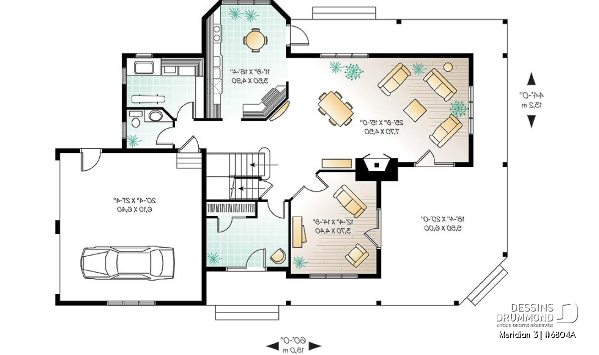 À l’intérieur, on attribue davantage de confort au secteur activités en aménageant la cuisine sur l’arrière et avec un volume en baie permettant d’y loger un coin dînette avec table et accès à la galerie alors qu’on regroupe la salle à manger et la salle de séjour autour d’un foyer bien centré. On obtient une seconde salle familiale ou salle de jeux en remplacement de la salle à manger initiale ( sur le modèle 2837 ) et on améliore le format de la buanderie et du vestibule de l’entrée principale.