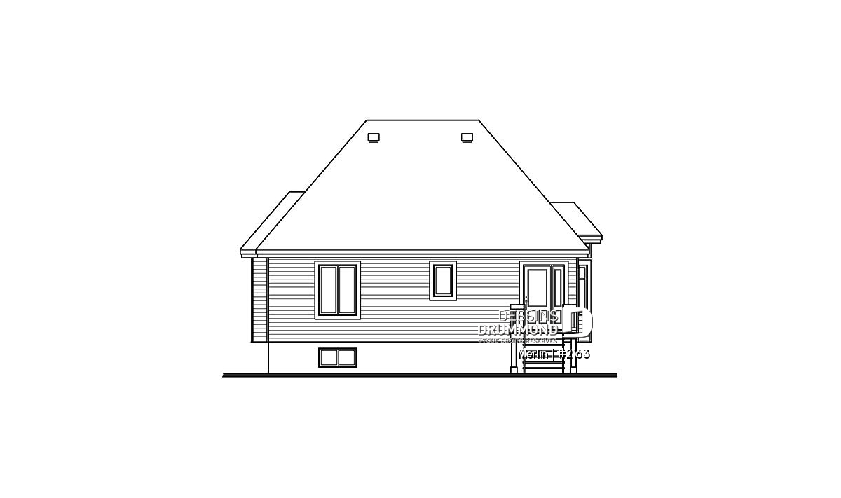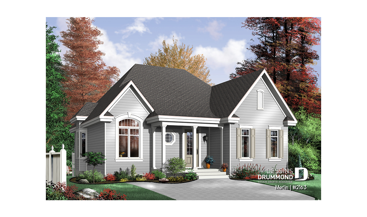 Vue avant - MODÈLE DE BASE - Plain-pied économique 2 chambres, plafond cathédrale partiel au salon, espace ouvert, beau style champêtre - Merlin