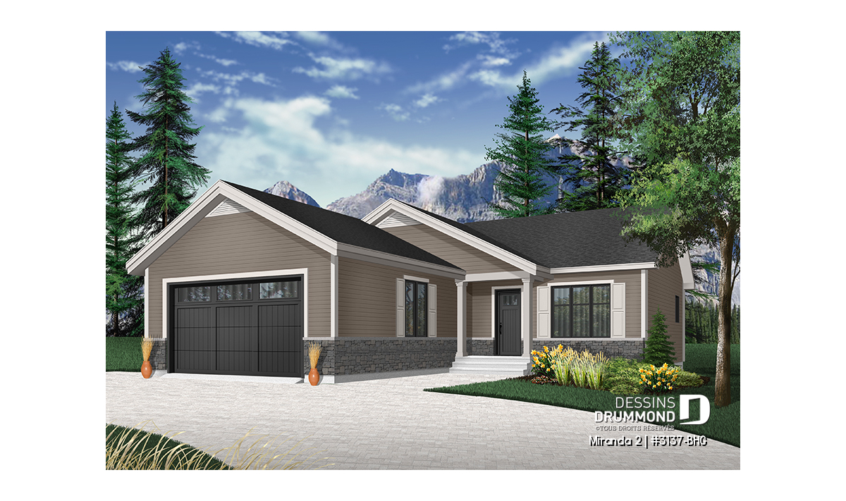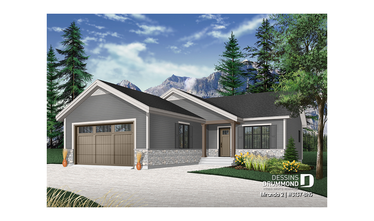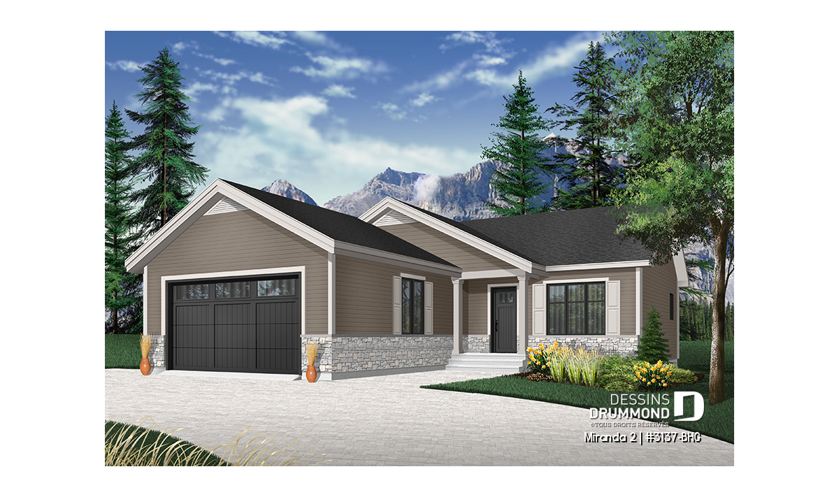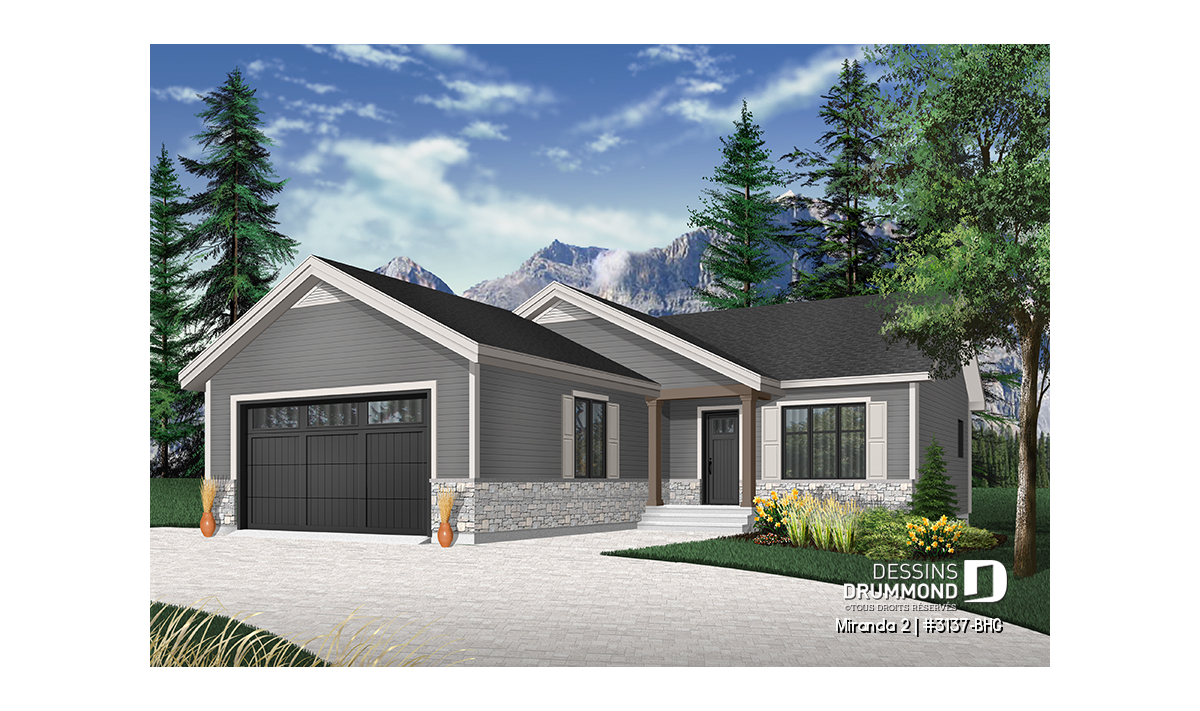 Le modèle de base, Miranda, a plus assurément de par son coût abordable et son allure moderne rustique, deux éléments populaires et recherchés par les acheteurs de première maison. Nous avons donc imaginé et conçu la version avec garage double en façade, idéale pour terrain étroit, car c’est une demande constante des clients qui ont visité nos agences Dessins Drummond afin de faire des modifications à ce modèle. De plus, fait non négligeable, le garage double offre un accès à la maison par l'entrée principale et aussi par le sous-sol.