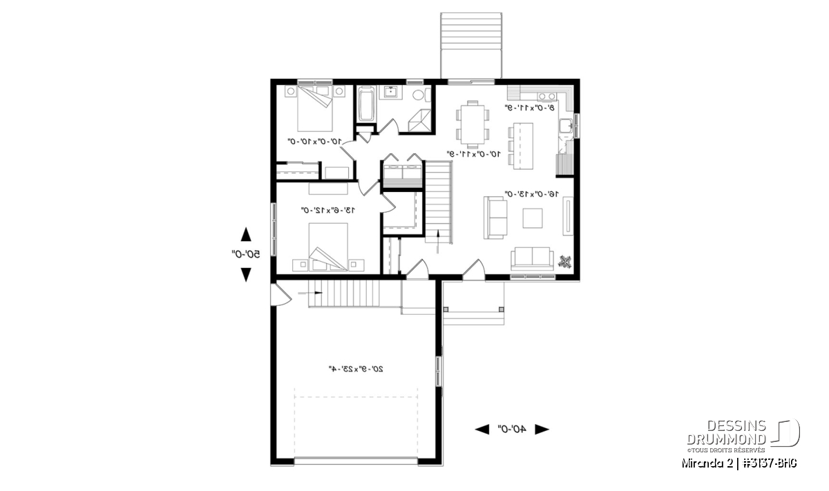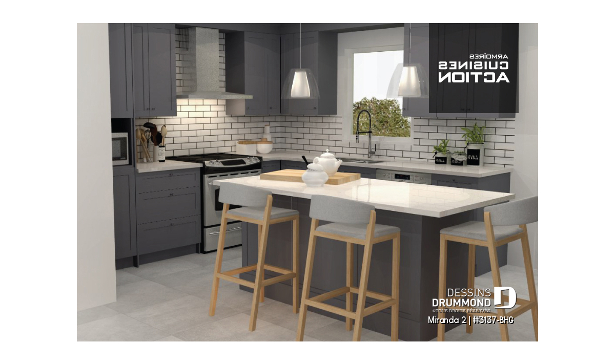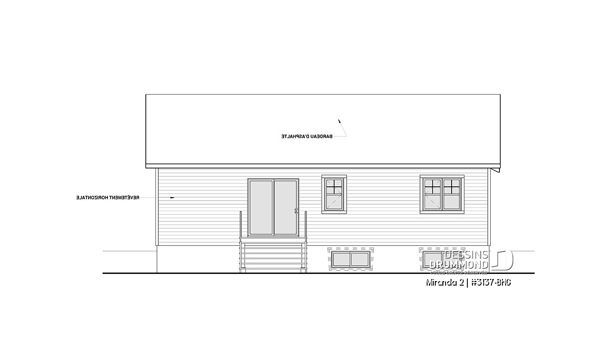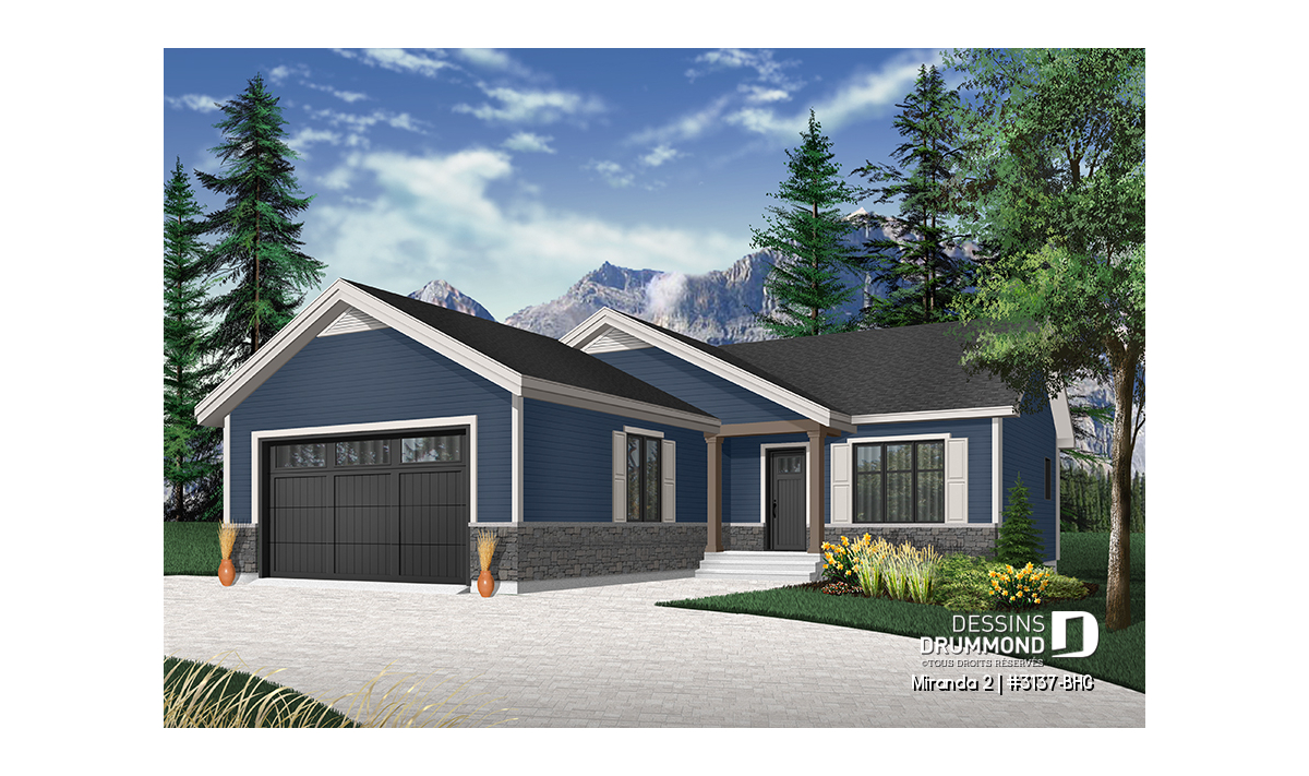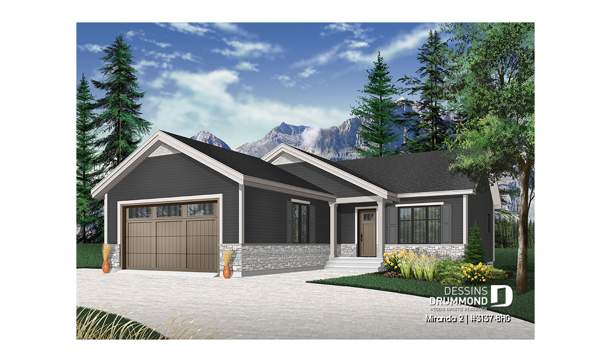 Le modèle de base, Miranda, a plus assurément de par son coût abordable et son allure moderne rustique, deux éléments populaires et recherchés par les acheteurs de première maison. Nous avons donc imaginé et conçu la version avec garage double en façade, idéale pour terrain étroit, car c’est une demande constante des clients qui ont visité nos agences Dessins Drummond afin de faire des modifications à ce modèle. De plus, fait non négligeable, le garage double offre un accès à la maison par l'entrée principale et aussi par le sous-sol.