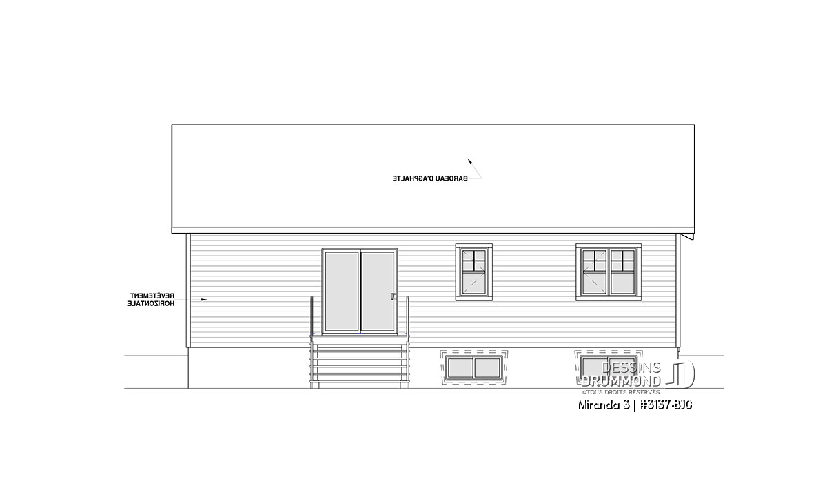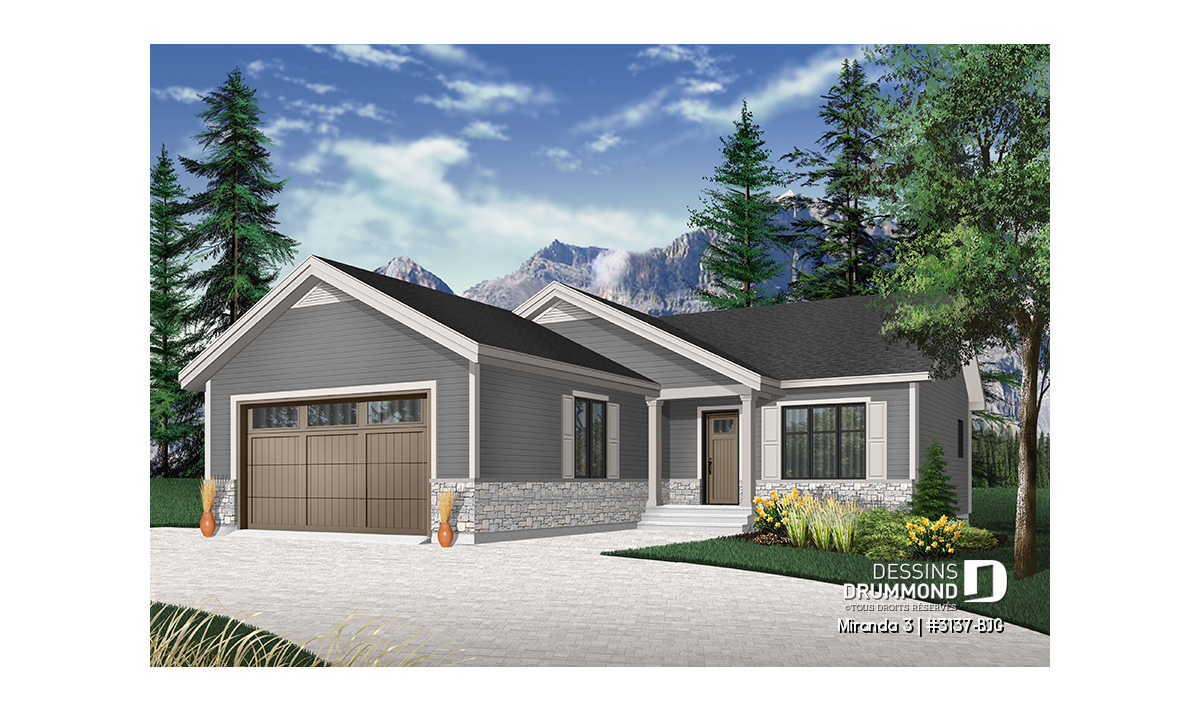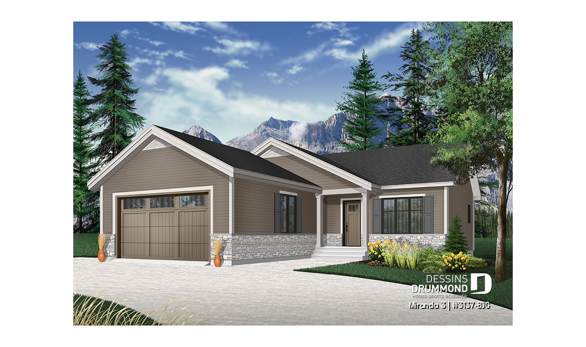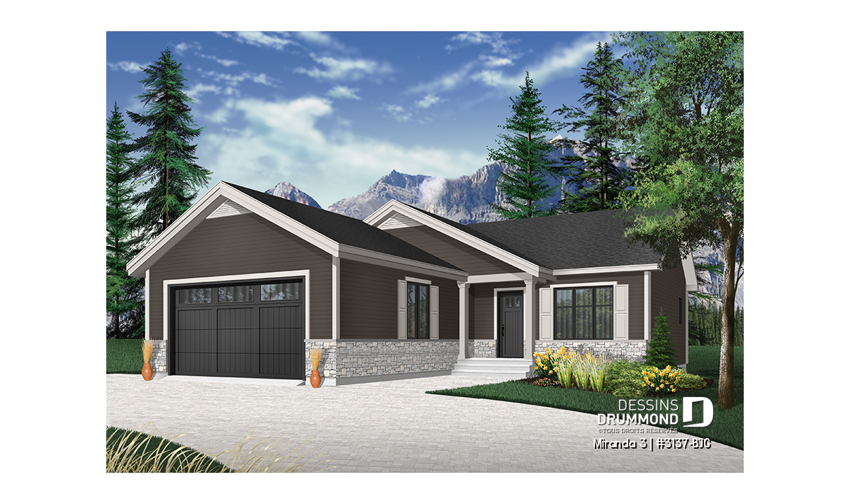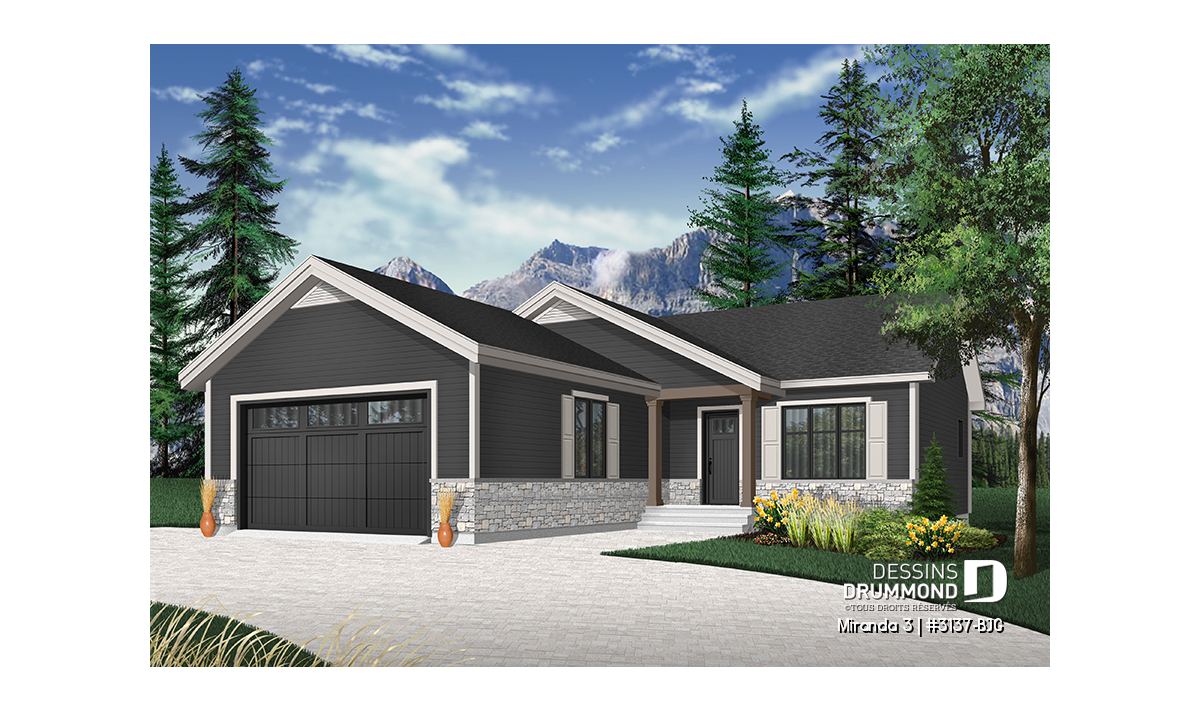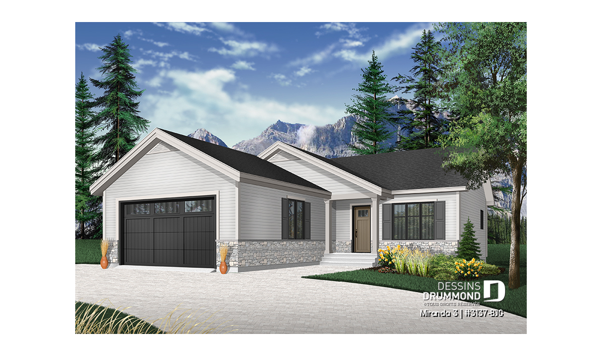 Le modèle de base, Miranda, a plu assurément de par son coût abordable et son allure moderne rustique, deux éléments populaires et recherchés par les acheteurs de première maison. Nous avons donc imaginé et conçu la version avec garage double en façade, soit la Miranda 2, idéale pour terrain étroit, car c’est une demande constante des clients qui ont visité nos agences Dessins Drummond afin de faire des modifications à ce modèle. De plus, fait non négligeable, le garage double offre un accès à la maison par l'entrée principale et aussi par le sous-sol.