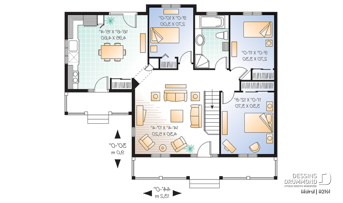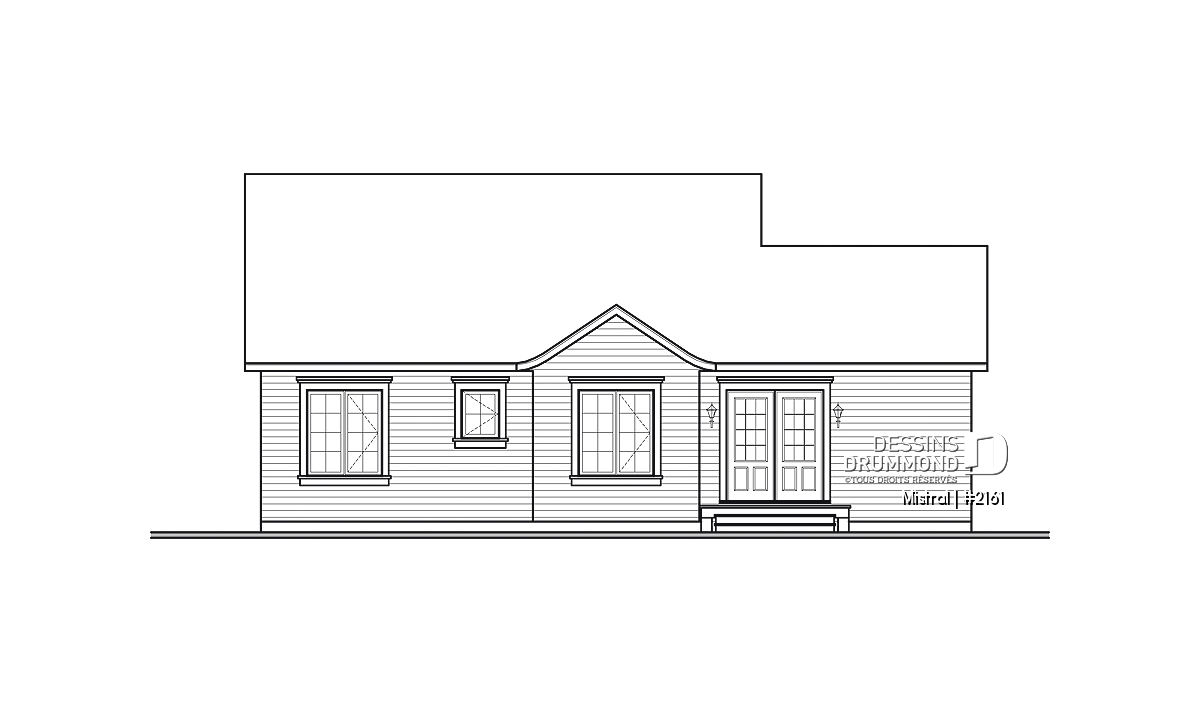 Réplique, version plain-pied, de la maison traditionnelle québécoise avec cuisine d’été, ce « bungalow » fut conçu suite à la popularité grandissante d’un modèle similaire ( 1478 à voir sur le site www.dessinsdrummond.com ) offrant, pour sa part, deux chambres à coucher.