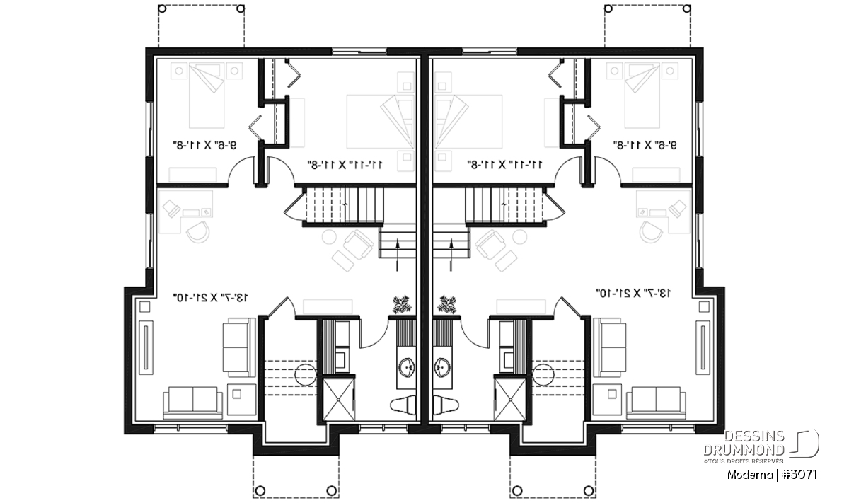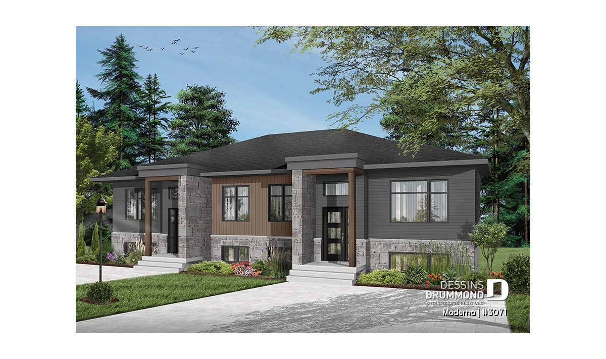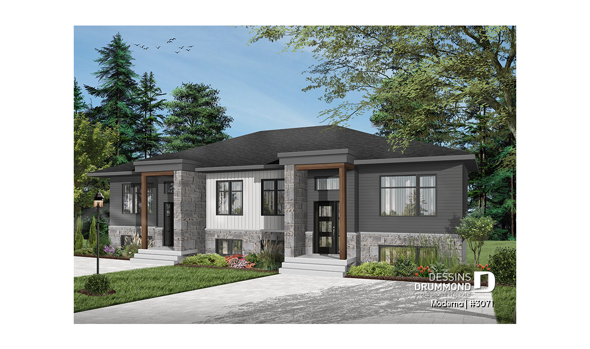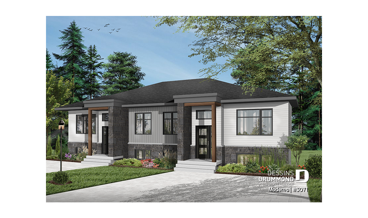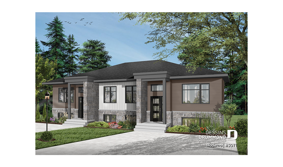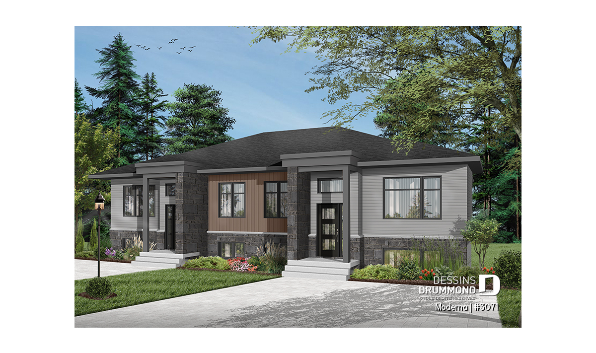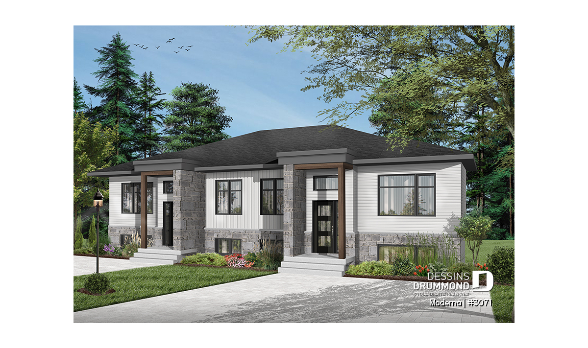 Plan de maisons jumelées no. 3071 (aussi nommé Moderna) très tendance de par ses différents éléments architecturaux modernes et originaux. Ce nouveau plan de jumelé propose un aménagement intérieur des plus intéressants pour chacune de ses deux unités avec ses quatre (4) chambres à coucher, deux salles de bain, et deux salons.