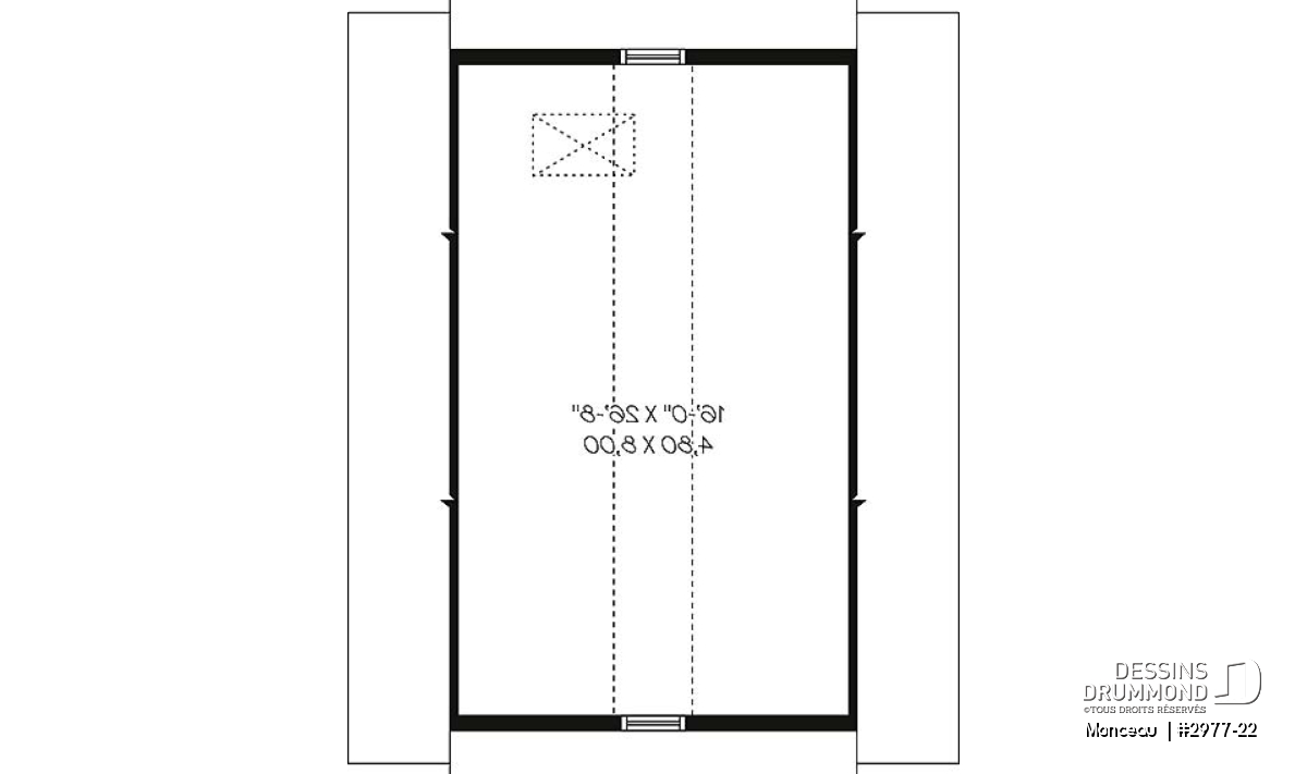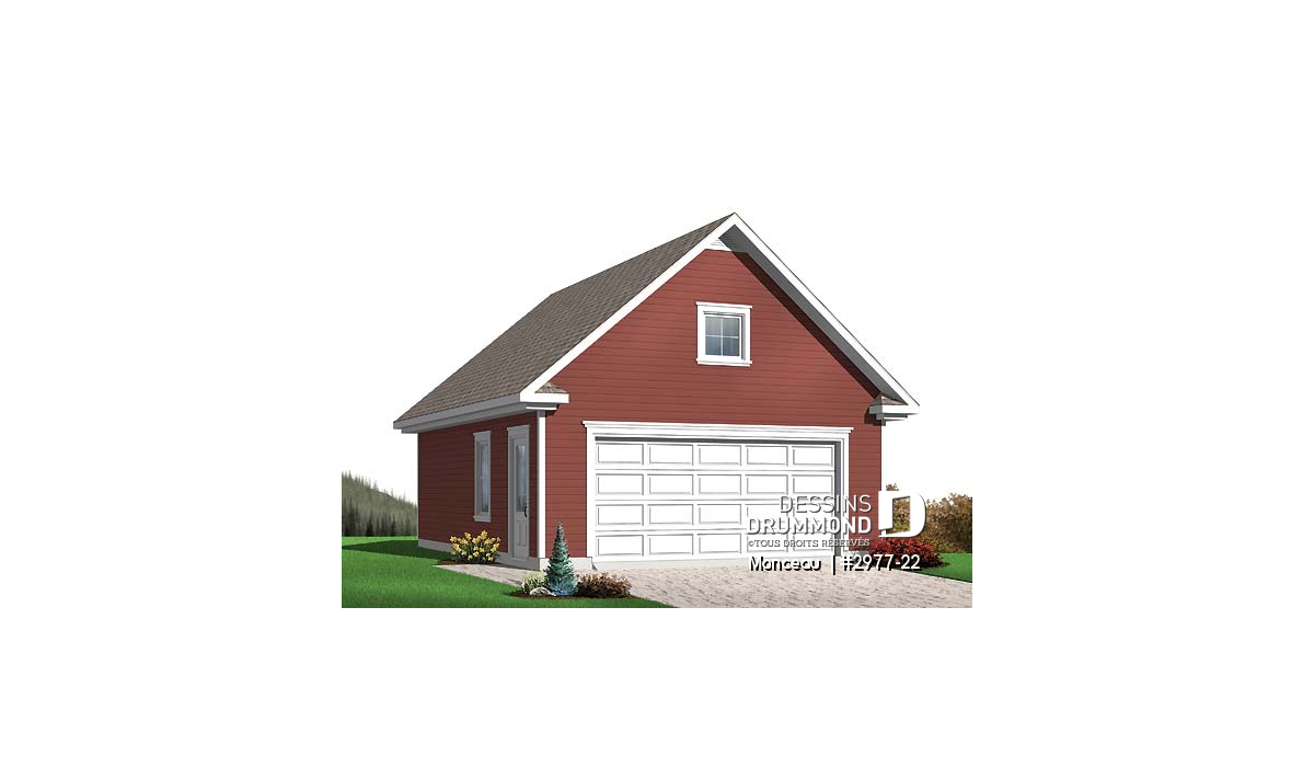 Plan de garage double, pour deux voiture, avec porte et fenêtre latérales. Espace rangement au grenier.