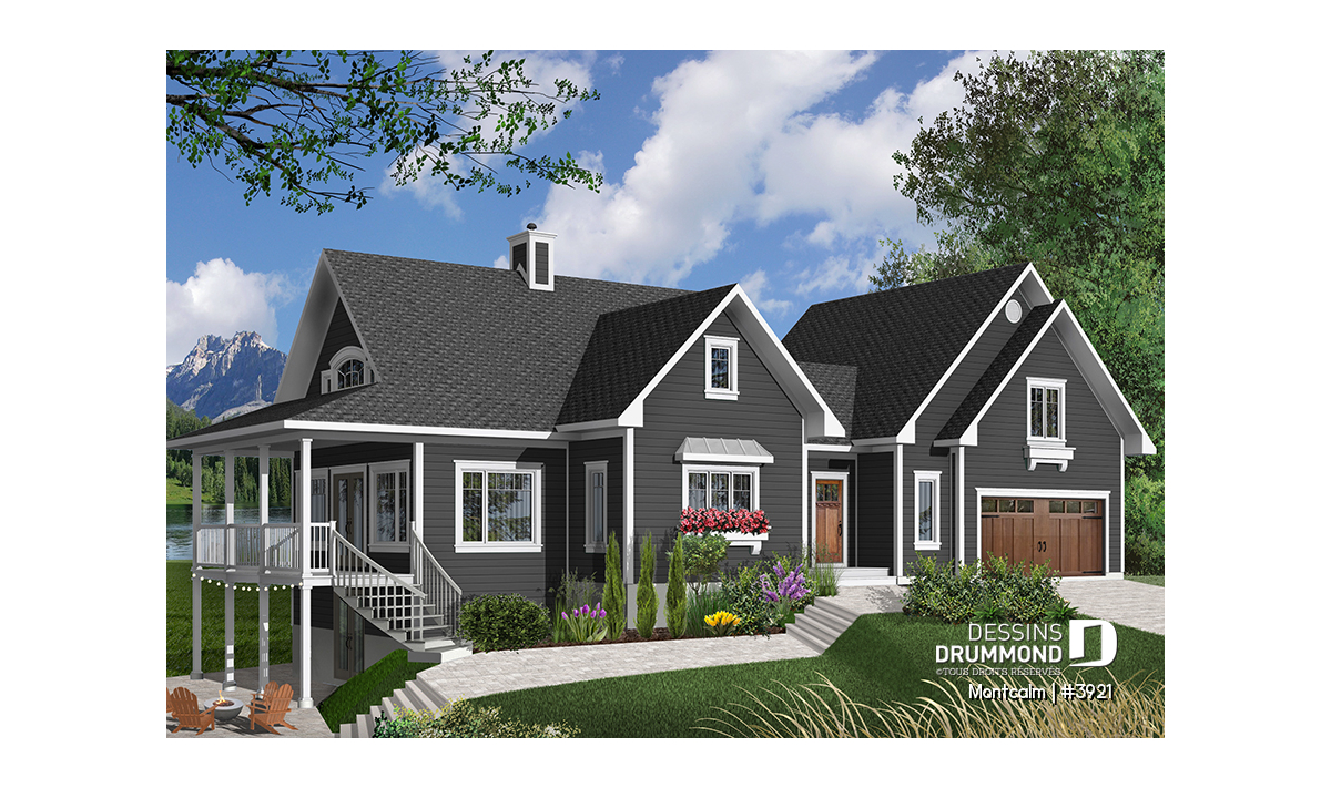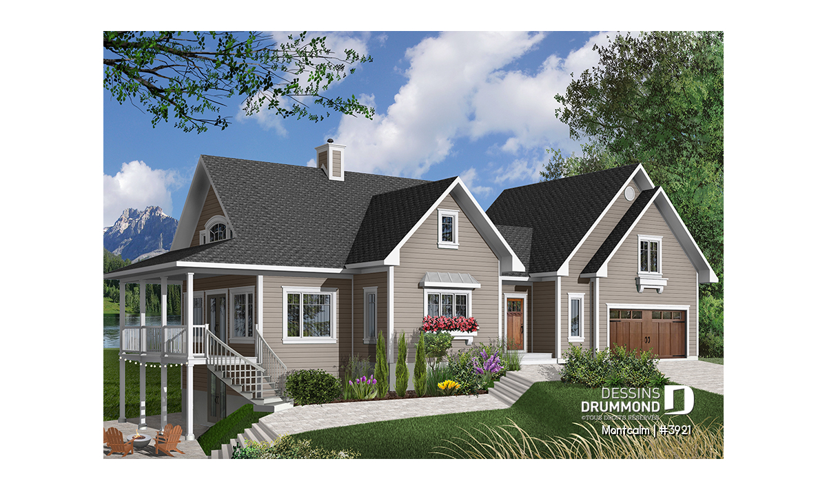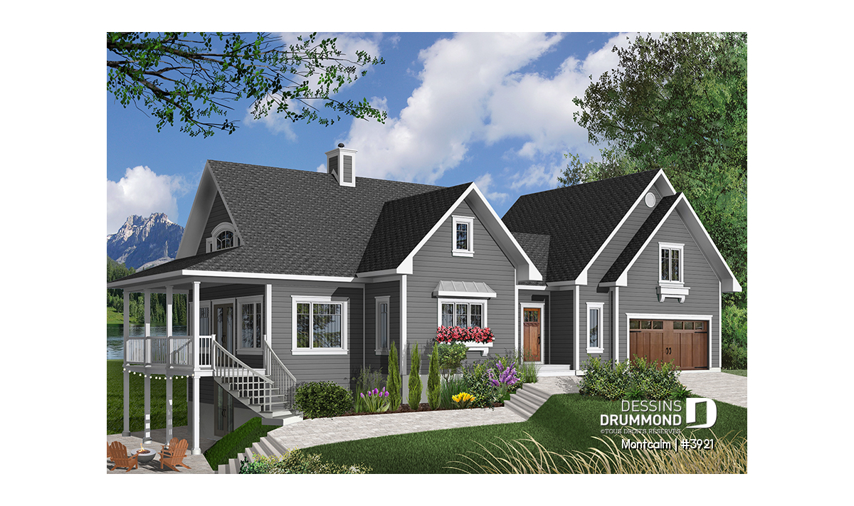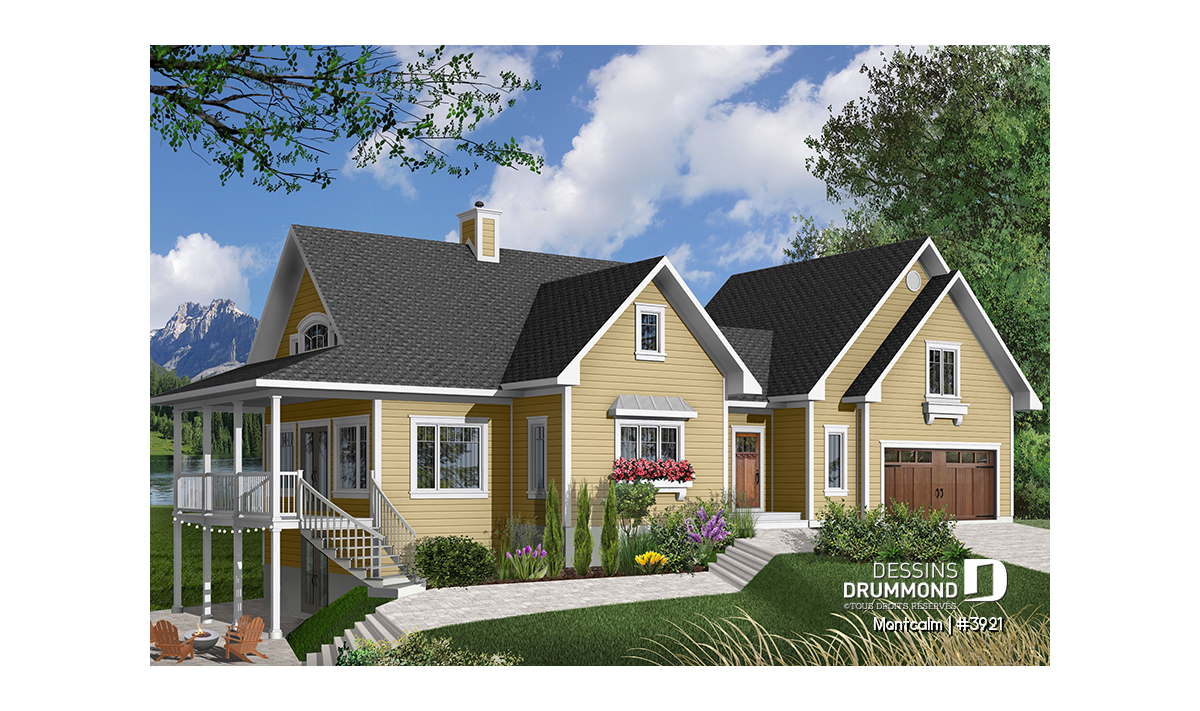 Superbe plan de maison genre chalet avec 3 à 4 chambres et garage double.
