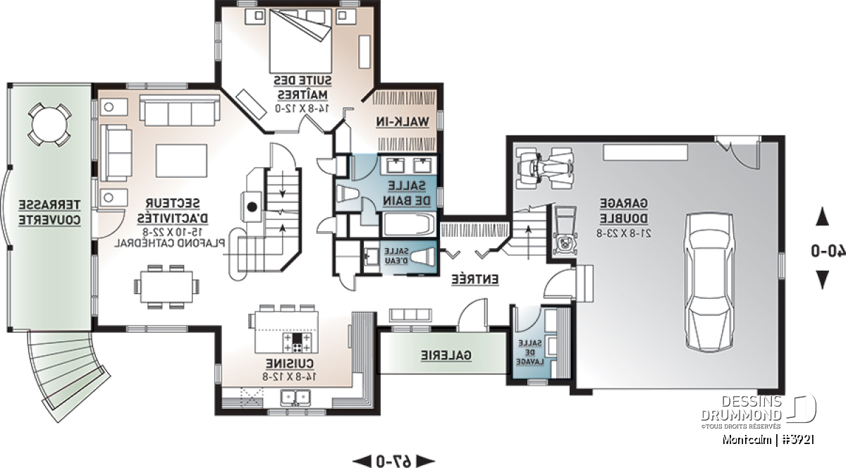Foyer, Mezzanine, Walk-in ch. maîtres, Suite d'invités, Suite des maîtres à l'étage, Suite des maîtres au rdc, Salle de lavage au rez-de-chaussée, Terrasse abritée, Plafond cathédrale, Loft, Plafond en pente, Vue paronamique, Aire ouverte, Ilôt