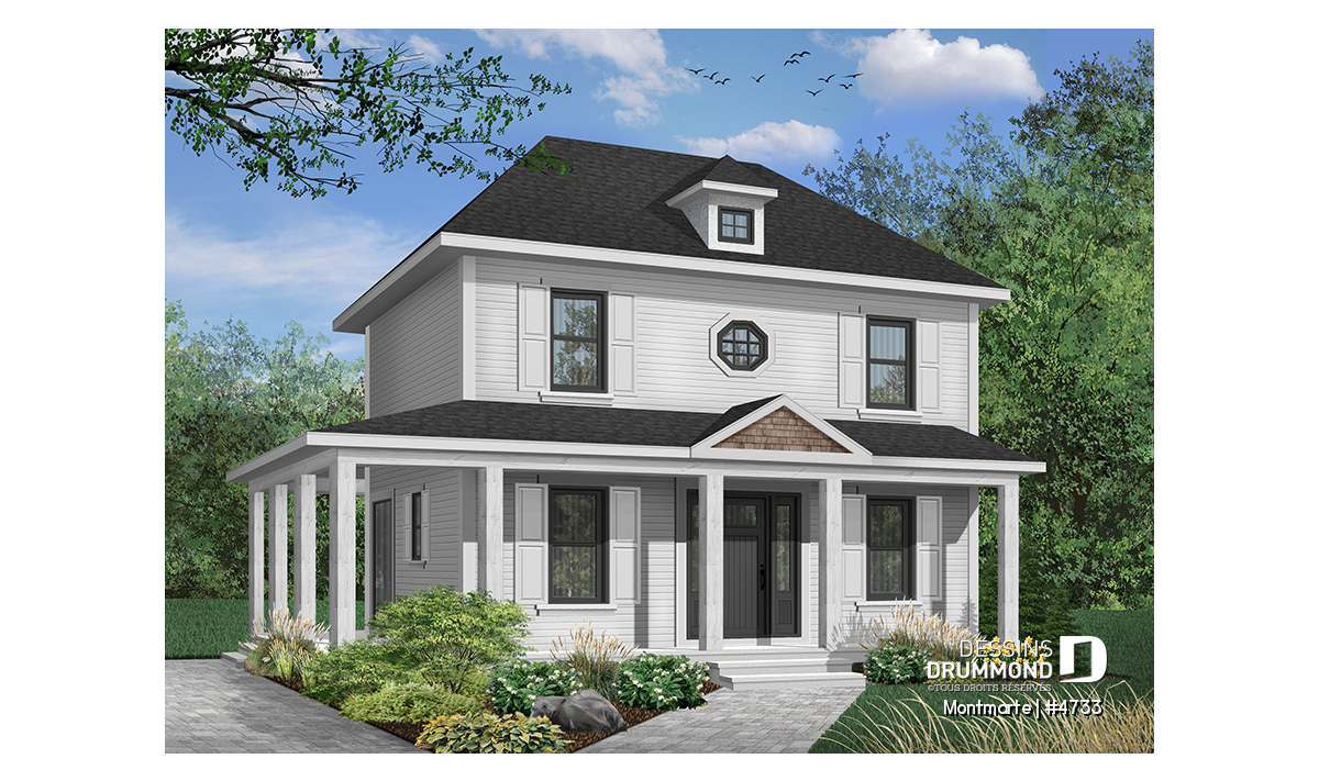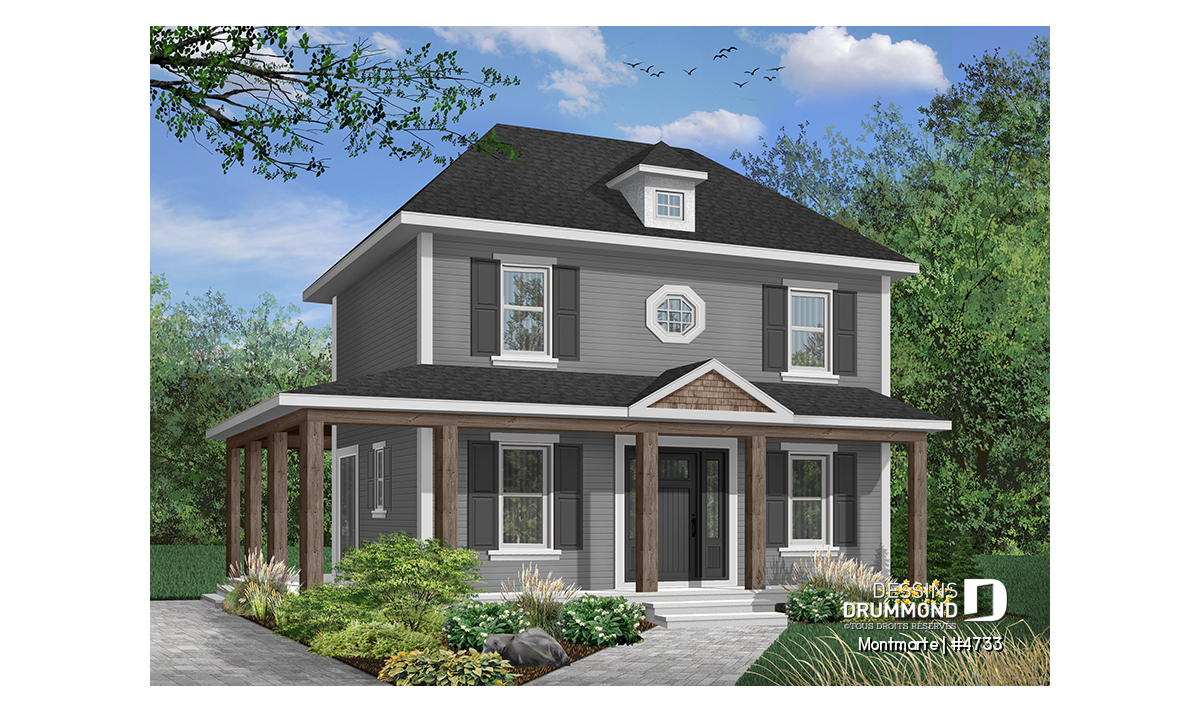 Plan de maison d'inspiration anglaise, à étage, 3 chambres, 2 salles de bain, galerie abritée