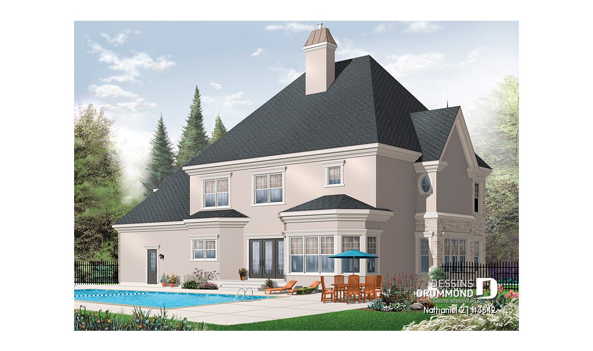 Vue arrière - MODÈLE DE BASE - Plan de maison luxueuse, garage triple, 2 suites des maîtres, grand espace boni, bureau, salle télé, foyer - Nathaniel 2