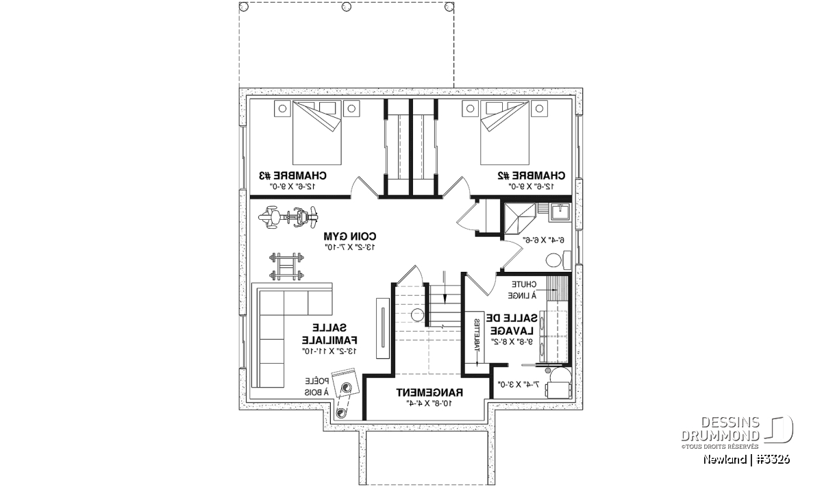 2 chambres, salle familiale, salle de douche, salle de lavage, espace pour gym ou salle de jeux, rangement.