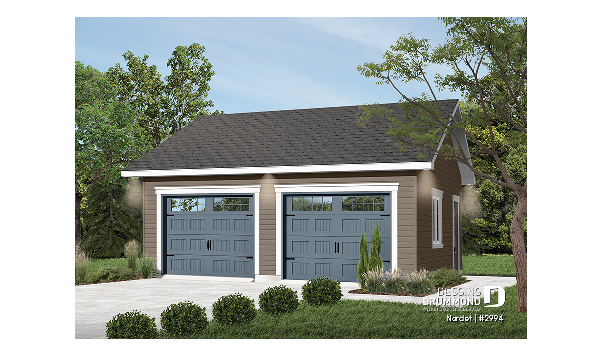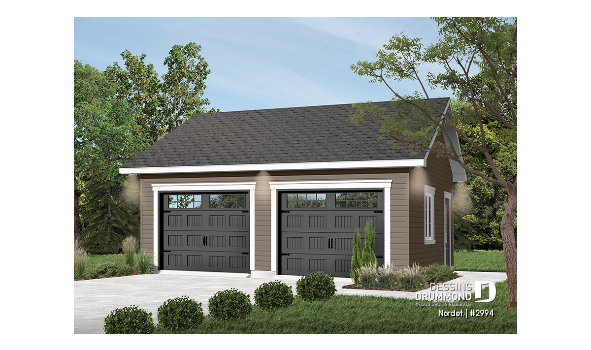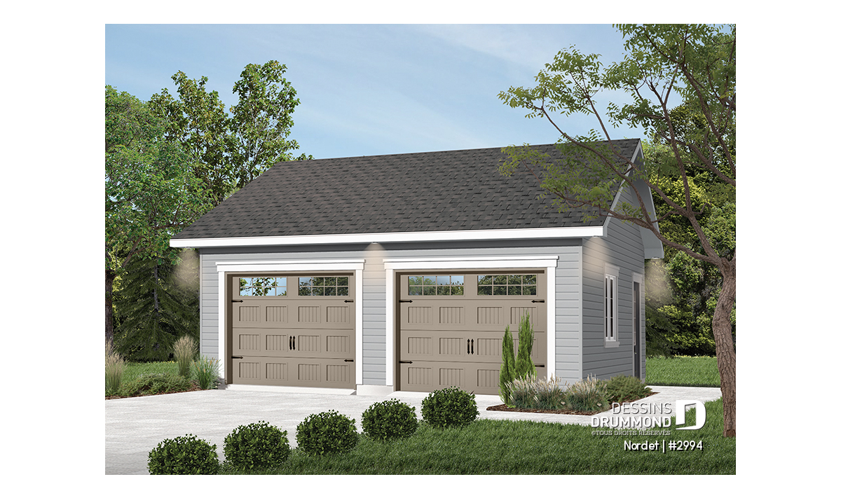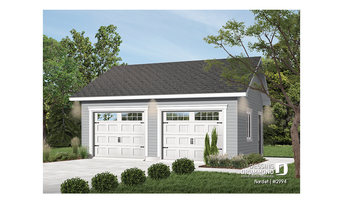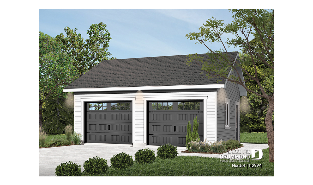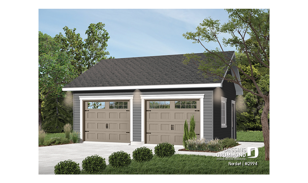 Le plan de garage double NORDET (#2994) séduit par son style champêtre polyvalent, conçu pour s’harmoniser facilement avec une grande variété de maisons et de chalets. Son architecture sobre et équilibrée en fait un choix durable, autant pour les constructions neuves que pour les projets d’ajout ou de rénovation.