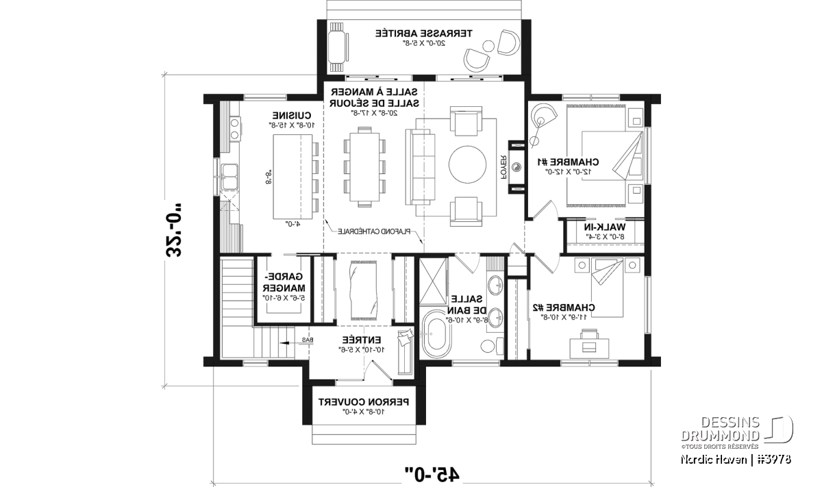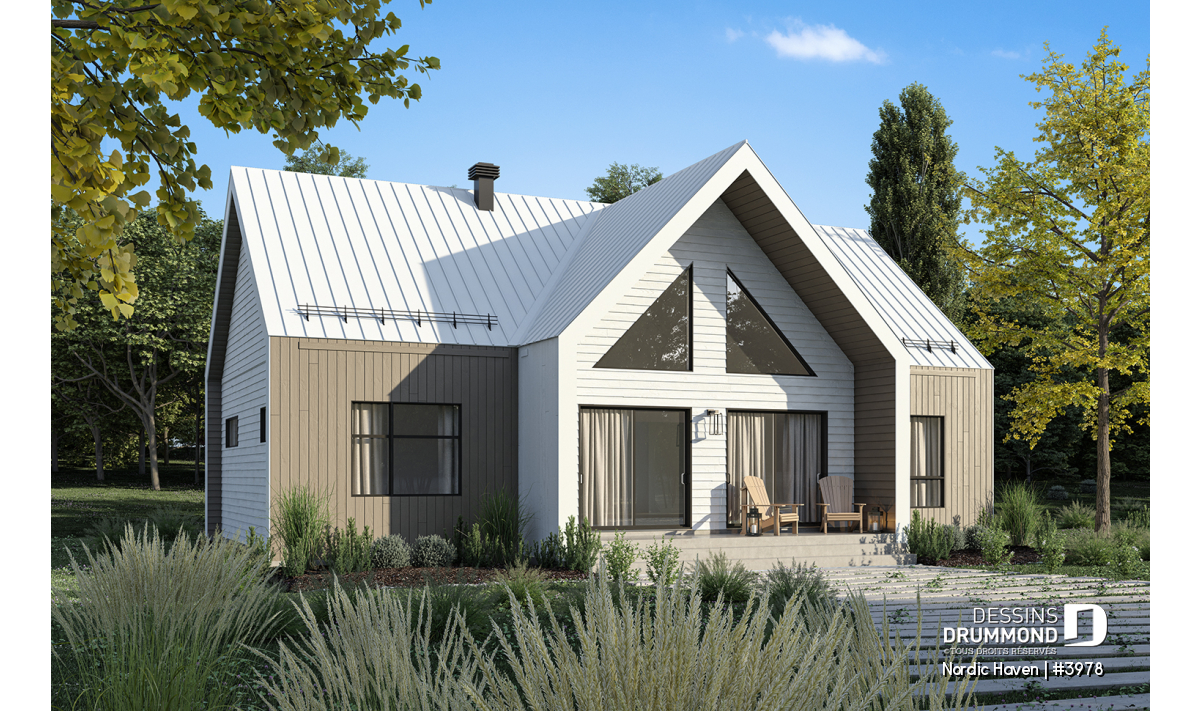 Le plan de maison NORDIC HAVEN (#3978), conçu par le bureau Dessins Drummond de Sherbrooke, se distingue par ses lignes épurées et son inspiration directement issue du style scandinave moderne. Très apprécié au Québec, ce courant architectural mise sur un équilibre harmonieux entre simplicité, chaleur et fonctionnalité. Son design sobre et élégant, rehaussé par un choix cohérent de matériaux et de couleurs, crée immédiatement une impression de raffinement accessible. Dès le premier regard, cette demeure compacte de 1 329 pi² au rez-de-chaussée, avec une superficie équivalente au sous-sol, séduit par sa luminosité, son ambiance accueillante et son souci du détail.
