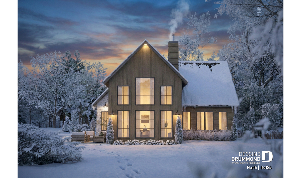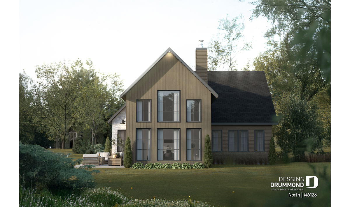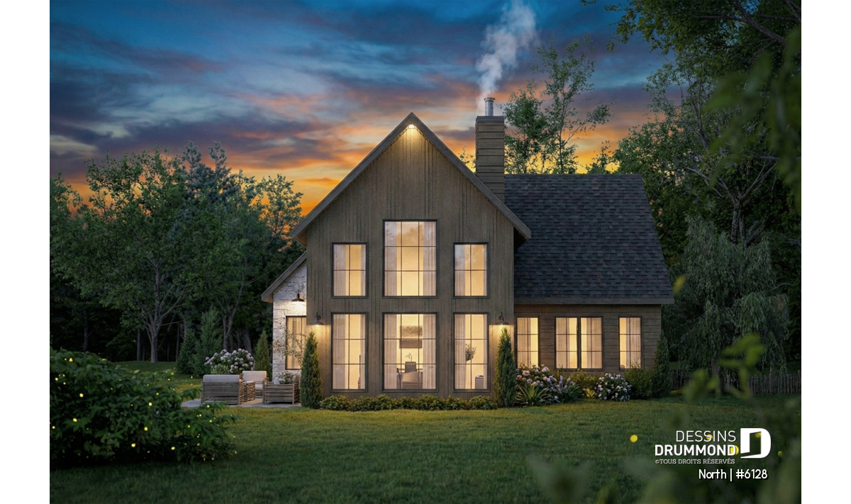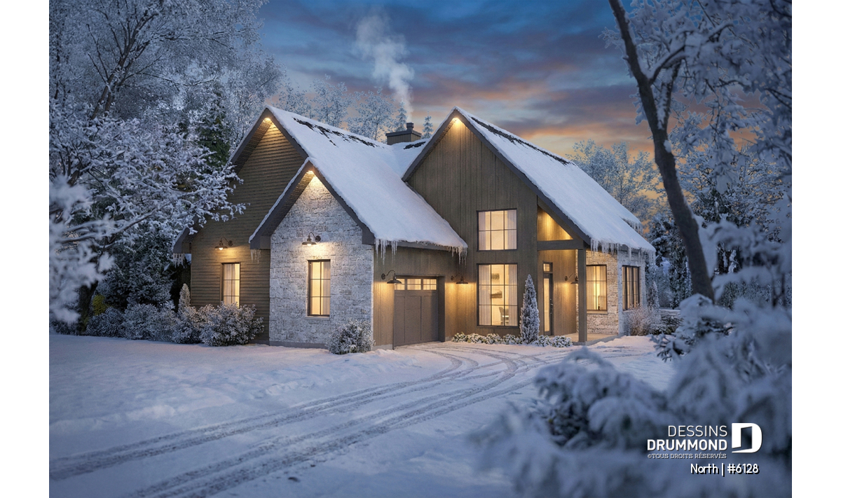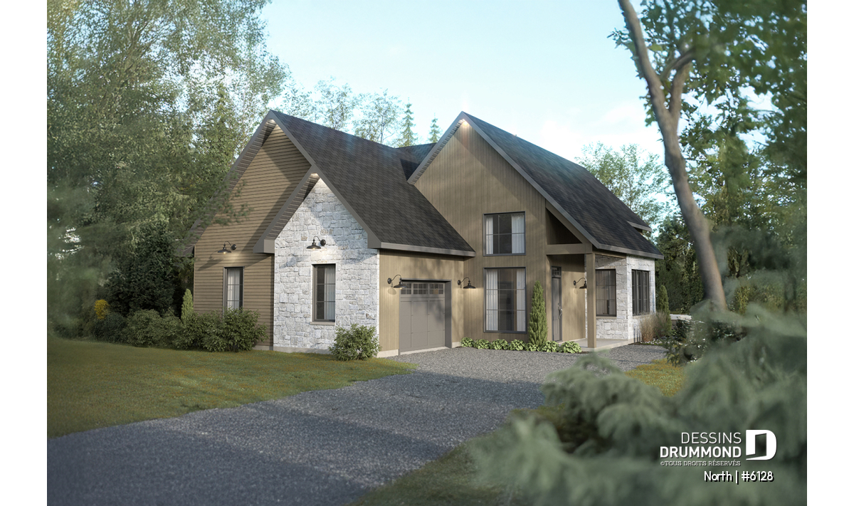 Le modèle North (#6128) est un plan de maison à étage avec garage qui séduit dès le premier regard par son style champêtre revisité et ses matériaux chaleureux et intemporels. Conçu pour offrir un cadre de vie lumineux et apaisant, il propose 1156 pi.ca. au rez-de-chaussée et 666 pi.ca. à l’étage, pour une superficie bien pensée qui maximise chaque espace. Ce plan est particulièrement adapté aux terrains offrant une vue sur l’eau ou en pleine nature, où la lumière naturelle et le paysage deviennent partie intégrante du quotidien. Le garage intégré ajoute à la fois fonctionnalité et confort, en facilitant l’accès à la maison en toute saison.