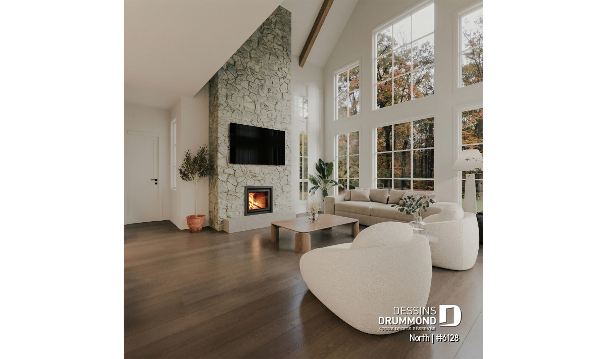 Le plan North (#6128) fait partie de la collection développée en collaboration avec STÛV, une référence en matière de foyers haut de gamme. Au cœur du salon, le foyer à bois STÛV s21 s’impose comme un véritable élément architectural. Plus qu’un simple point de chaleur, il devient une pièce maîtresse du design, apportant une ambiance chaleureuse et contemporaine à l’espace de vie. Son intégration a été soigneusement pensée pour maximiser à la fois le confort et l’esthétique, tout en créant un lieu de rassemblement naturel dans la maison.
