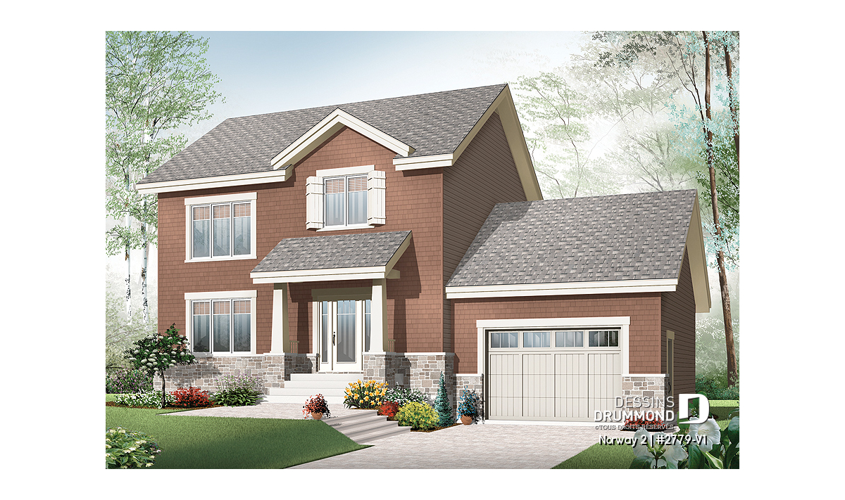 Avec son extérieur de style Craftsman ou d’approche artisanale dû à l’usage de pierre, de parement imitation bardeaux de cèdre et de colonnes en pointe sur base de pierre, cette maison, aux lignes extérieures simples, se veut à la fois chaleureuse et fort invitante. Entrons donc sans plus tarder !