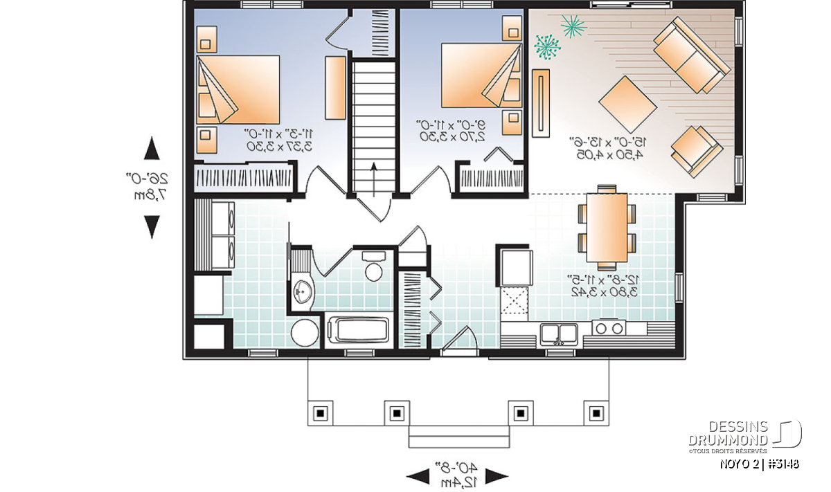 Pour ce plan de plain-pied, le point central de base regroupe ici, l’espace entrée, la cuisine et le coin repas ainsi que la salle de bain et le rangement/buanderie. À ce module, qui prend place en façade principale de la maison, nous greffons une salle de séjour tout en lumière et entièrement ouverte sur l’arrière ainsi que deux chambres dont celle des maîtres qui bénéficie pour sa part de deux garde-robes pour le plus grand bonheur des propriétaires.