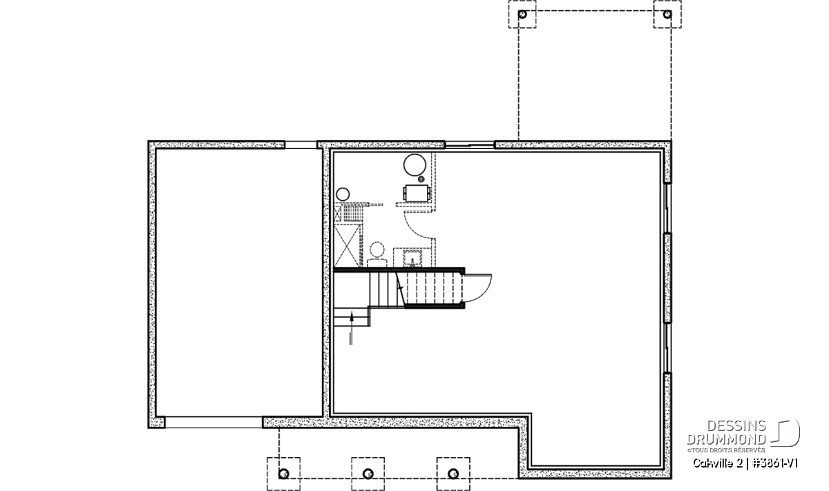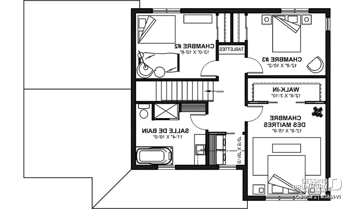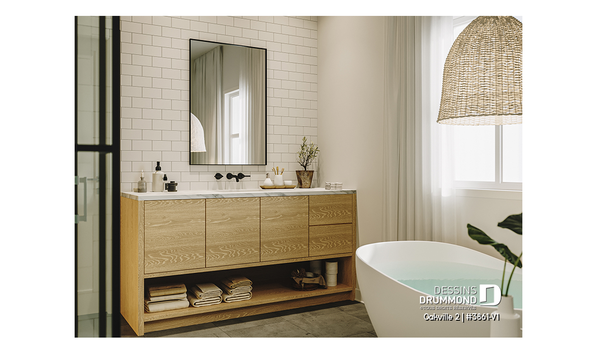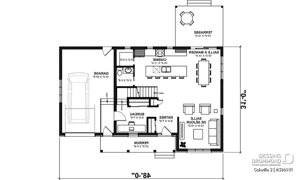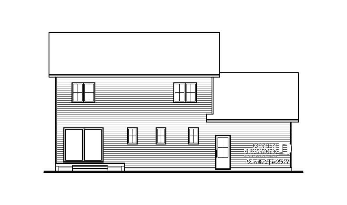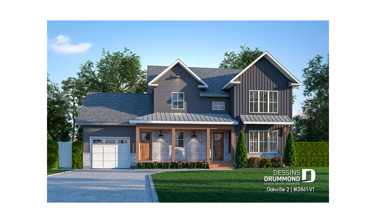 Le plan de maison OAKVILLE 2 (#3861-v1) offre 908 pi.ca. au rez-de-chaussée et 902 pi.ca à l'étage, en plus d'un garage simple et d'un sous-sol non fini, à aménager.