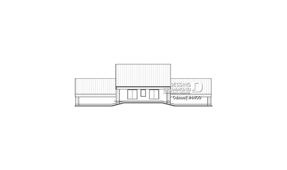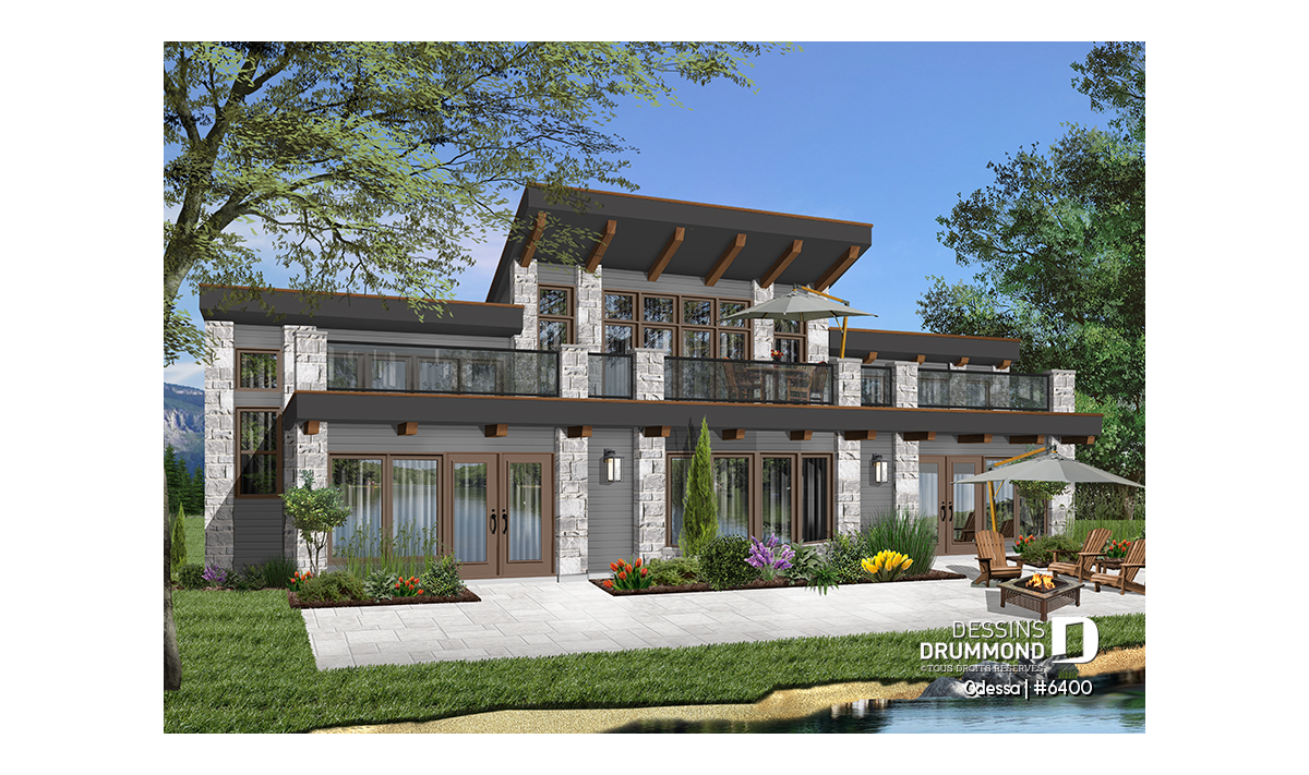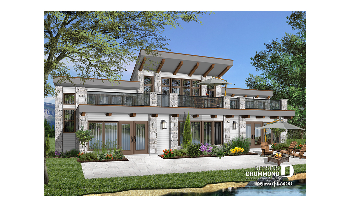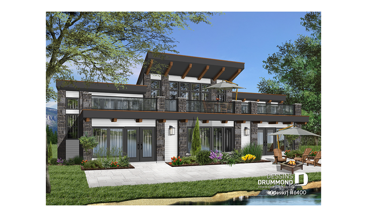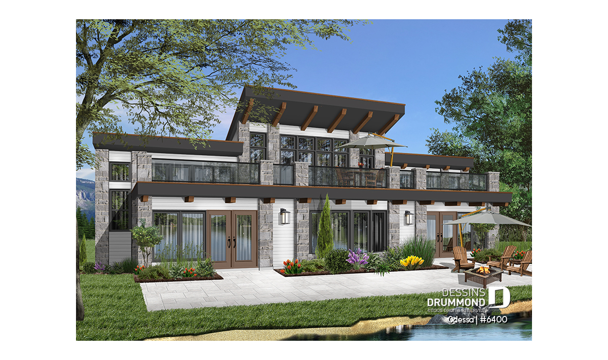 Vue arrière - MODÈLE DE BASE - Plan maison moderne bord de l'eau, 3 chambres, 2.5 salles de bain, énorme terrasse à l'étage, 2 salons, foyer - Odessa