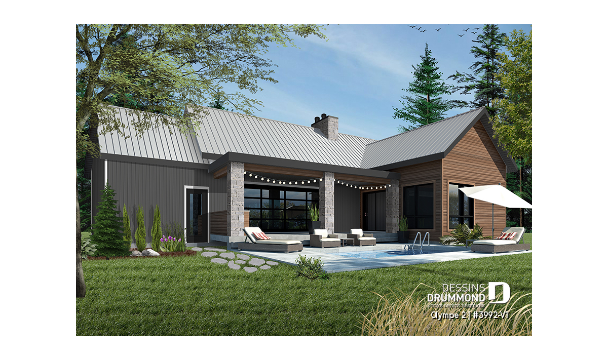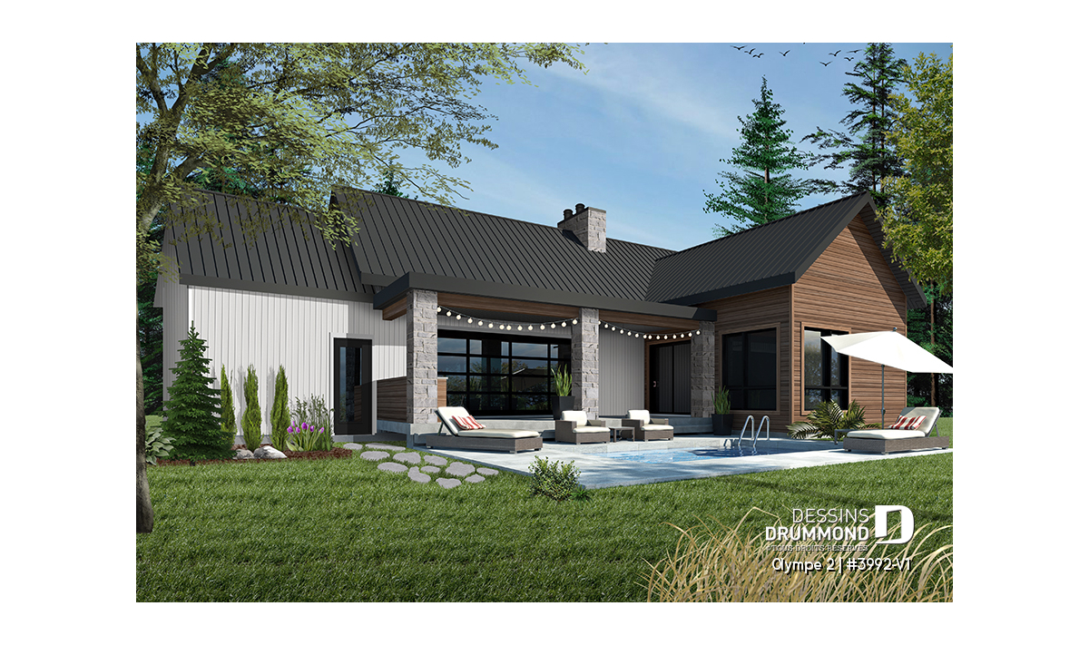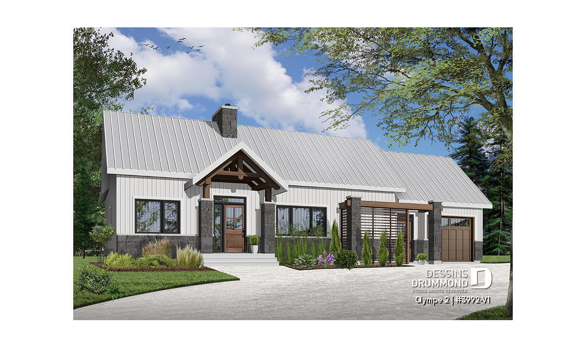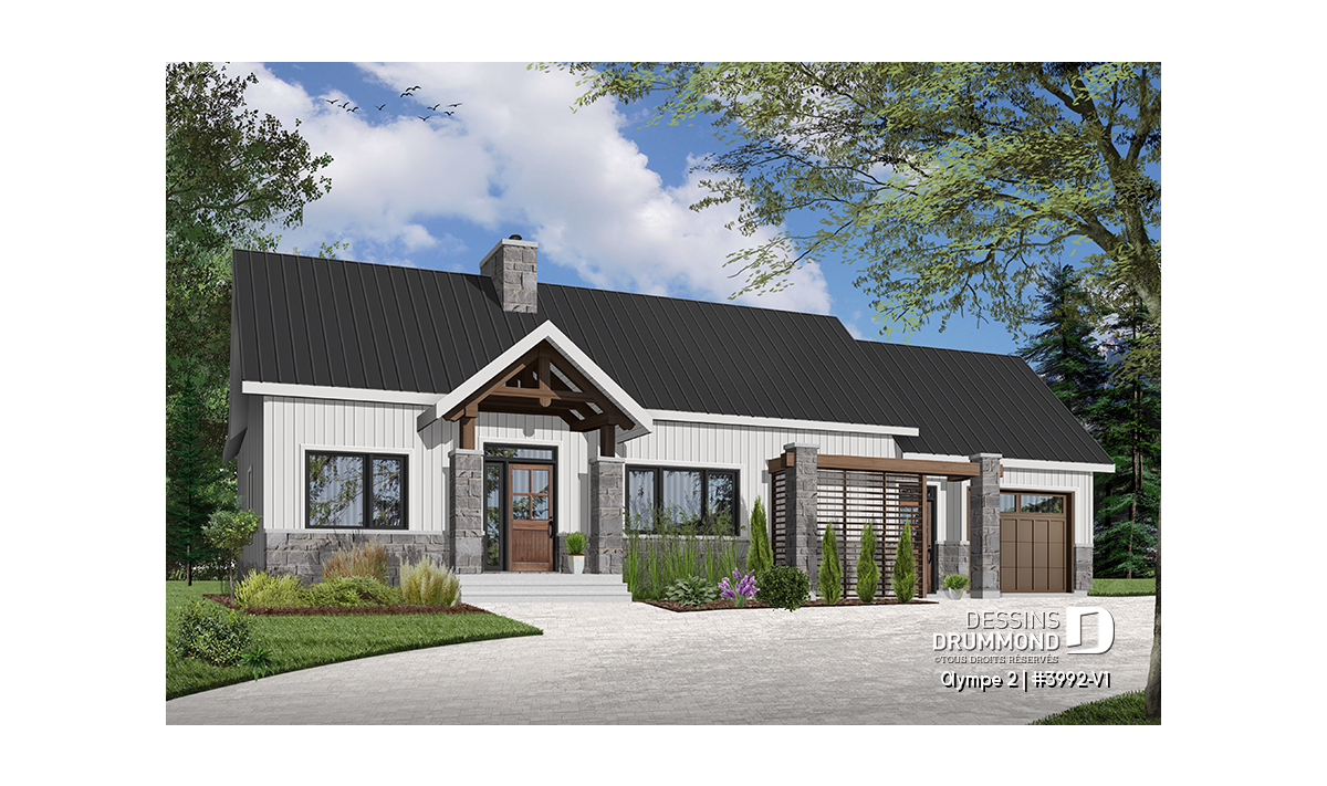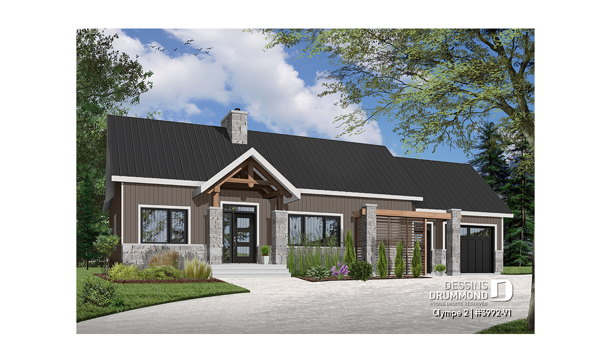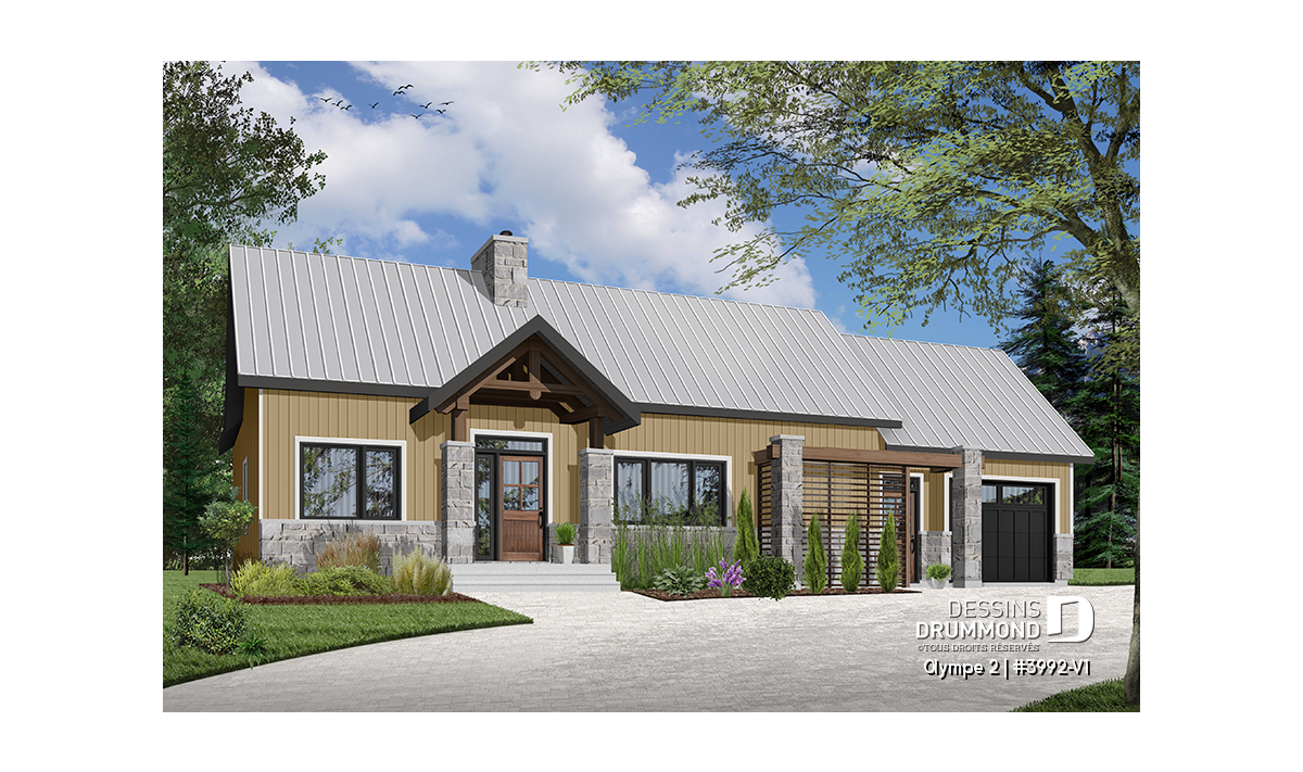 Qu’il soit situé aux abords d’un lac ou aux pieds d’un mont de ski, le nouveau plan de maison Olympe 2 (plan # 3992-V1), qui se veut être la version avec garage de notre plan # 3992, rappelle ce chalet tant aimé où il fait bon entrer!