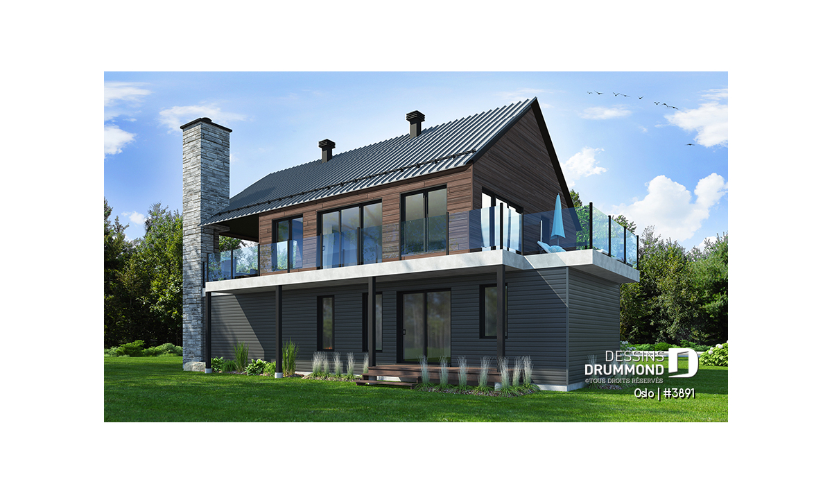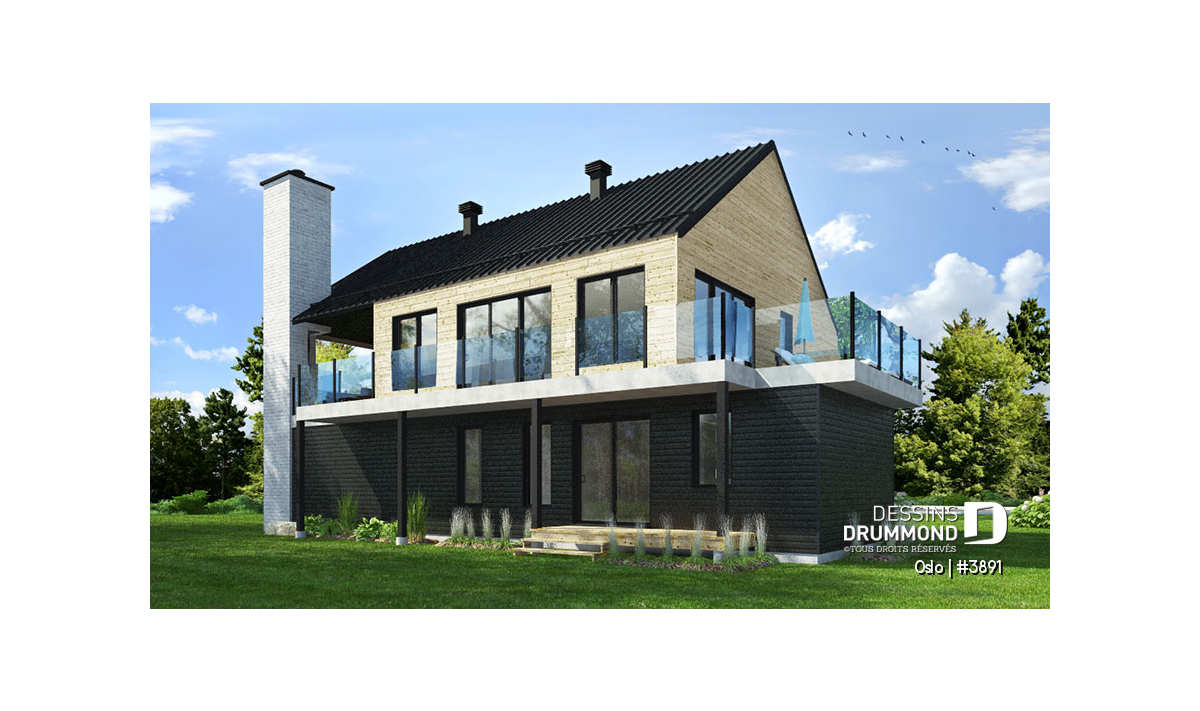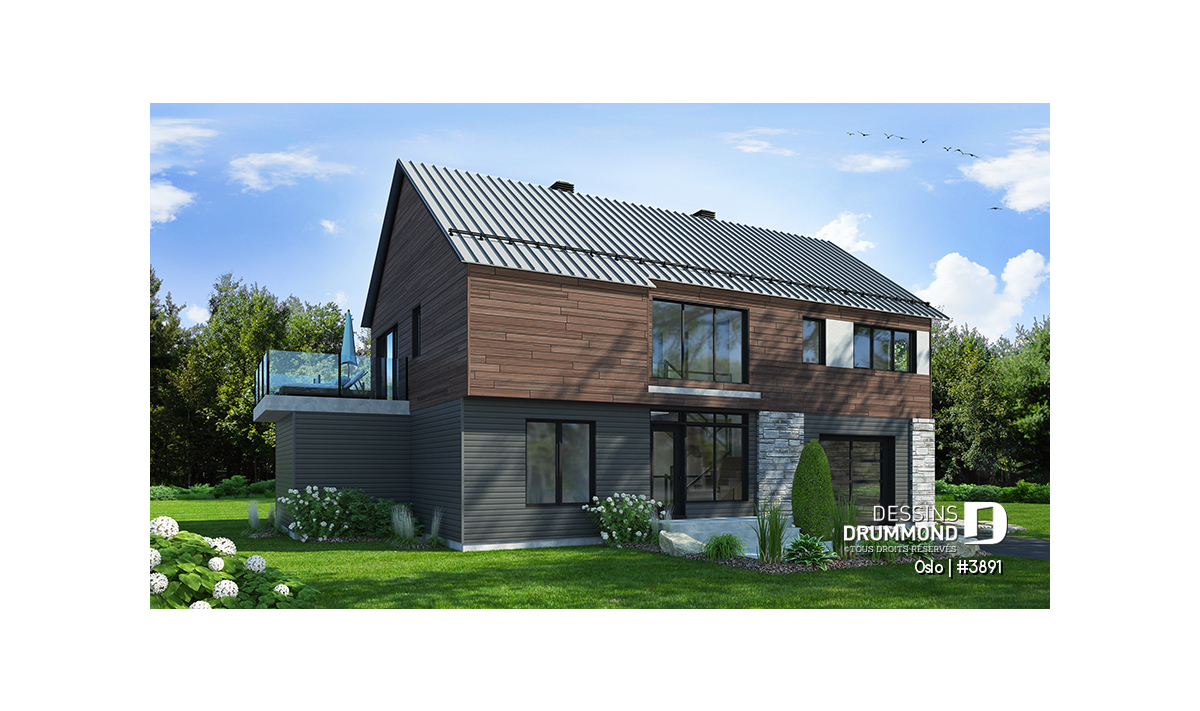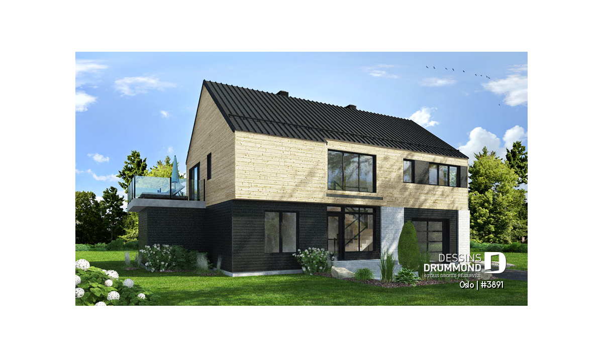 Modèle de maison de style Moderne Rustique, d’inspiration Scandinave, le nouveau plan no. 3891 aussi appelé Oslo, propose un heureux mariage de matériaux nobles, aux teintes rustiques et chaleureuses à la fois. L’élément vedette de cette superbe maison est sans aucun doute la généreuse terrasse, partiellement abritée à l’étage, qui propose un foyer extérieur au bois, question de devancer l’été ou de le prolonger bien au chaud et à l’abri des intempéries. Ce modèle avec garage sera parfait pour une construction sur un terrain proposant une vue panoramique sur un plan d’eau, une montagne ou un paysage pittoresque de campagne.