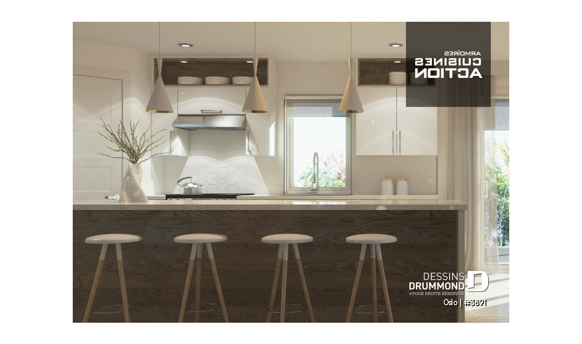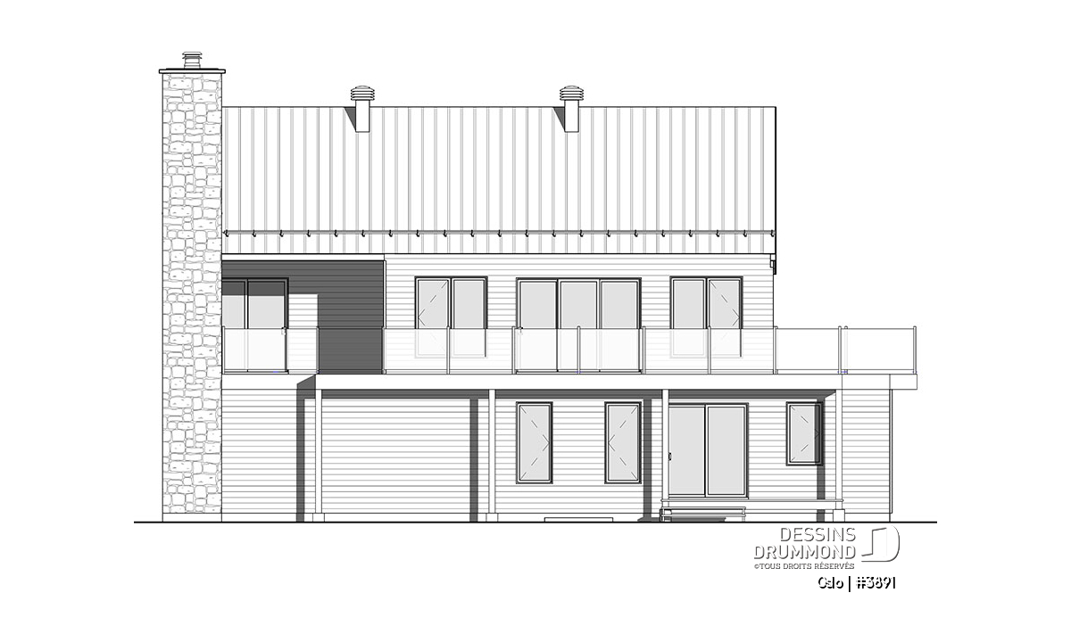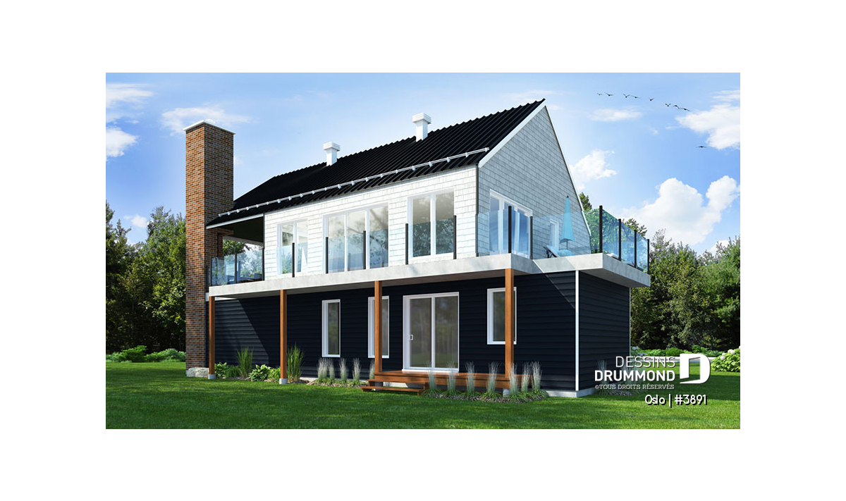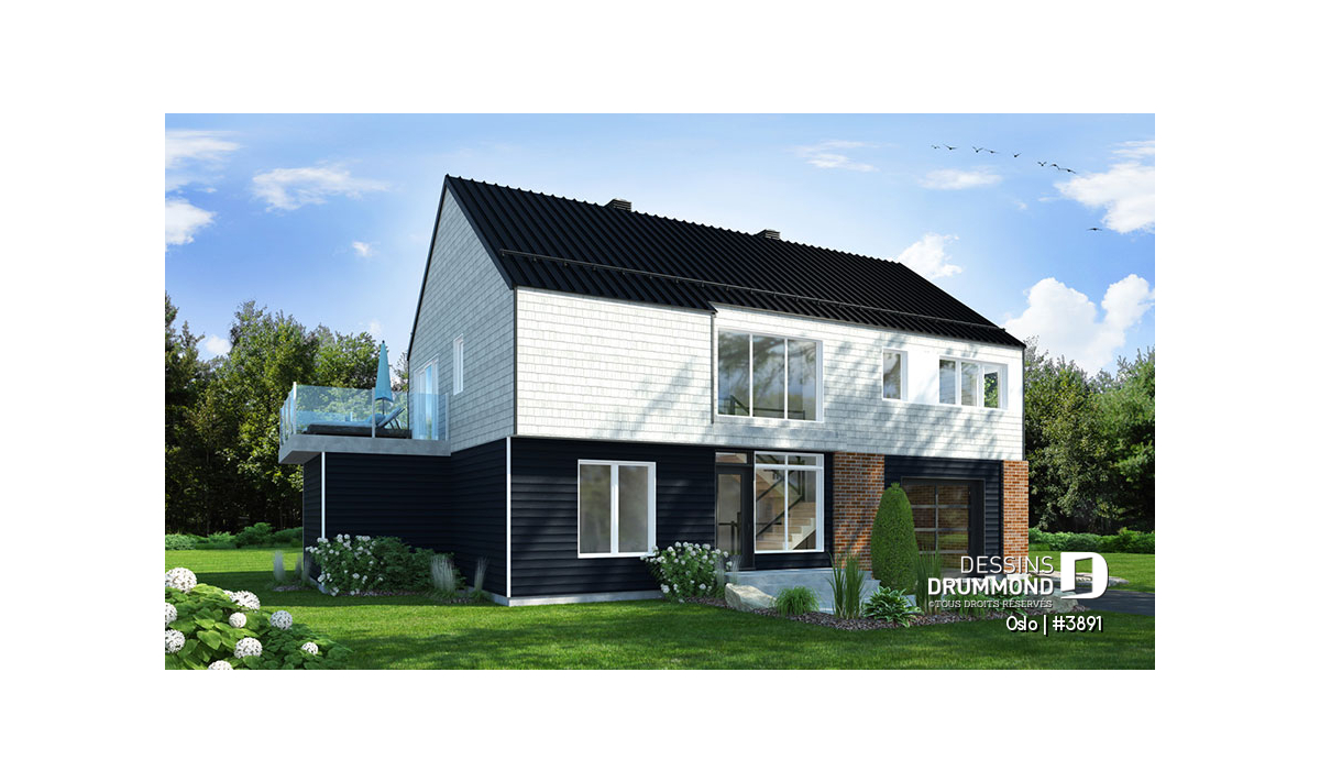 Modèle de maison de style Moderne Rustique, d’inspiration Scandinave, le nouveau plan no. 3891 aussi appelé Oslo, propose un heureux mariage de matériaux nobles, aux teintes rustiques et chaleureuses à la fois. L’élément vedette de cette superbe maison est sans aucun doute la généreuse terrasse, partiellement abritée à l’étage, qui propose un foyer extérieur au bois, question de devancer l’été ou de le prolonger bien au chaud et à l’abri des intempéries. Ce modèle avec garage sera parfait pour une construction sur un terrain proposant une vue panoramique sur un plan d’eau, une montagne ou un paysage pittoresque de campagne.