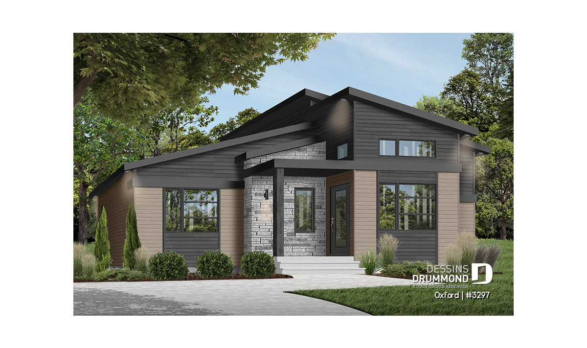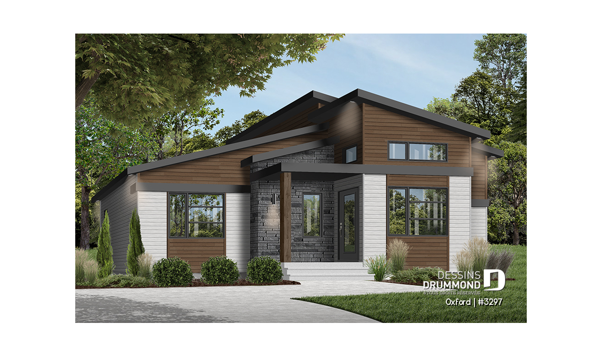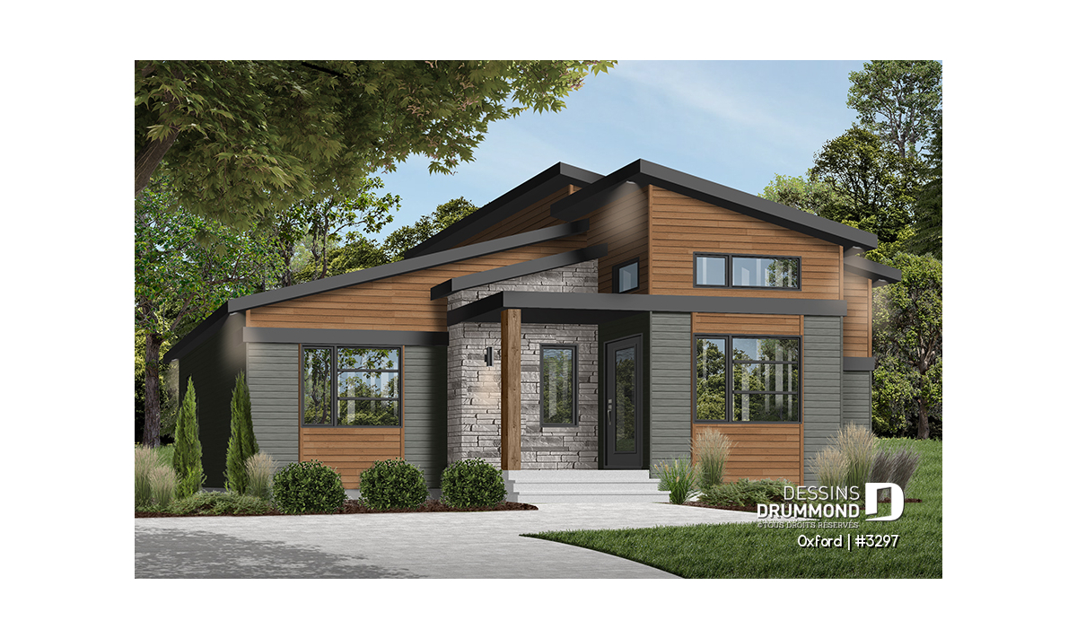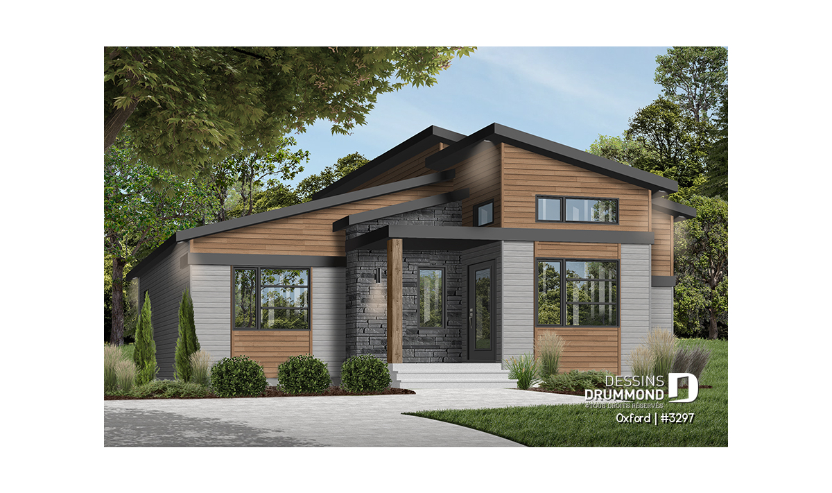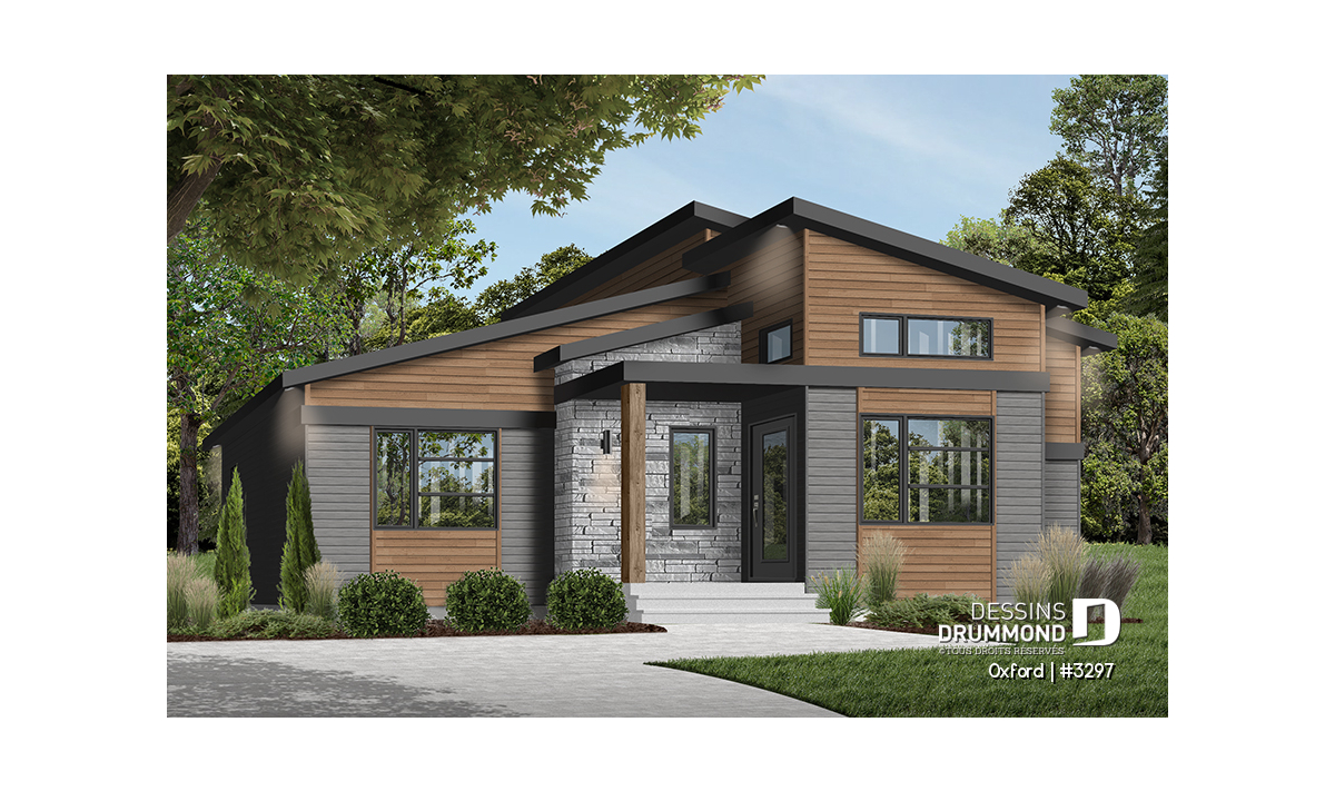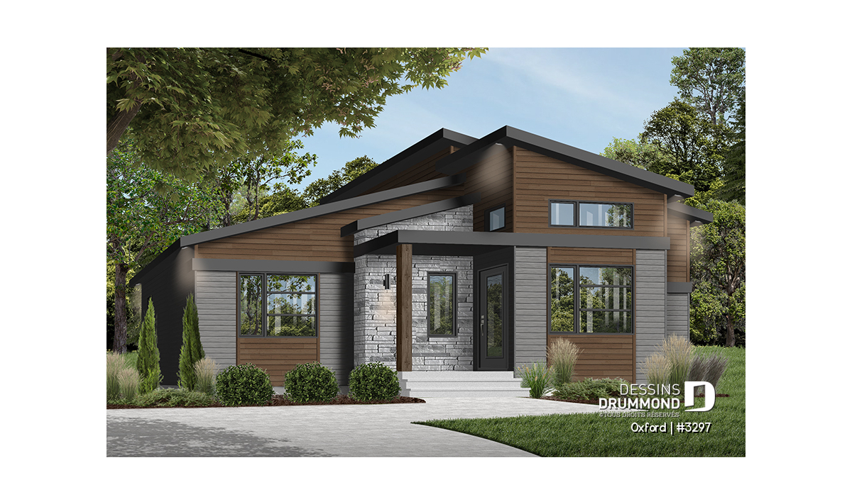 Superbe plan de plain-pied de style Mid-Century très tendance et proposant des matériaux nobles et chaleureux à la fois.