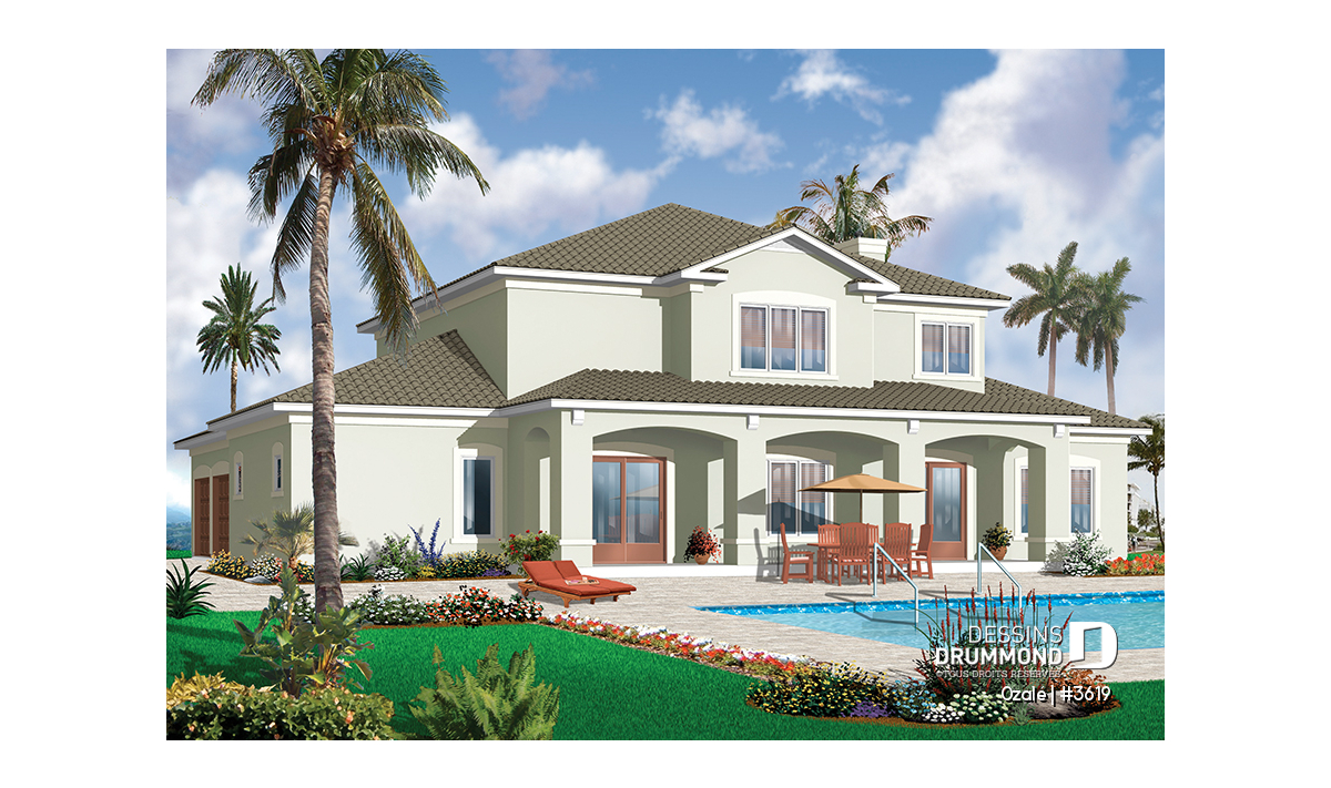 Vue avant - MODÈLE DE BASE - Plan de maison style Floride, 6 chambres, 5 salles de bain, 2 salons, foyer, grande cuisine, garage 3 voitures - Ozalé
