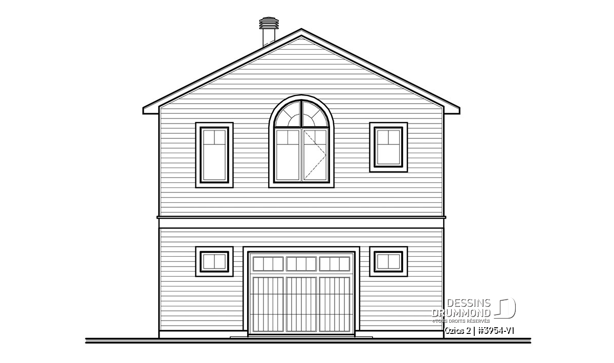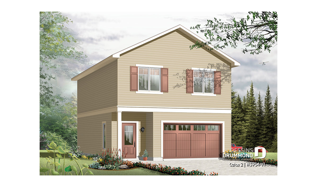 Vue avant – Modèle ORIGINAL - Plan de grand garage simple + atelier, logement 2 chambres à l'étage, aire ouverte, beaucoup de rangement - Ozias 2