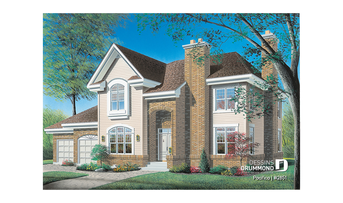 Plan de maison à étage de style traditionnelle, avec garage double.