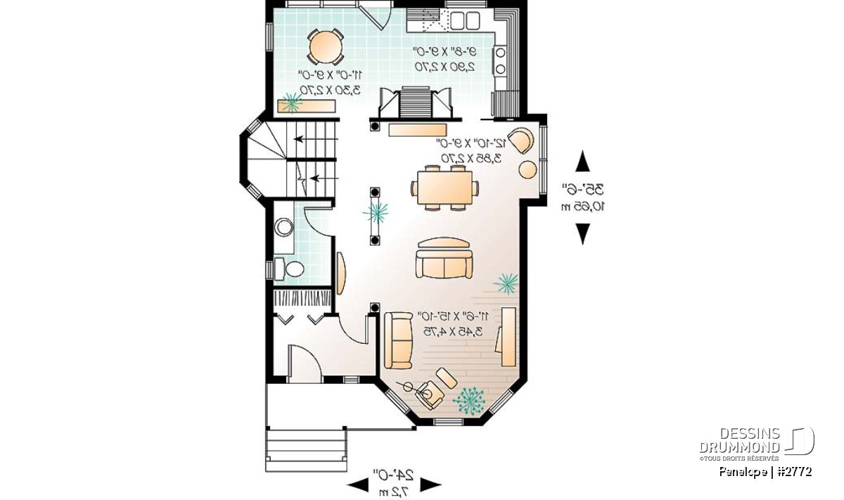 Plafond à 9 pi au rez-de-chaussée. Rangements intégrés, balcon avant abrité, fenestration abondante. Parfait pour terrain étroit.